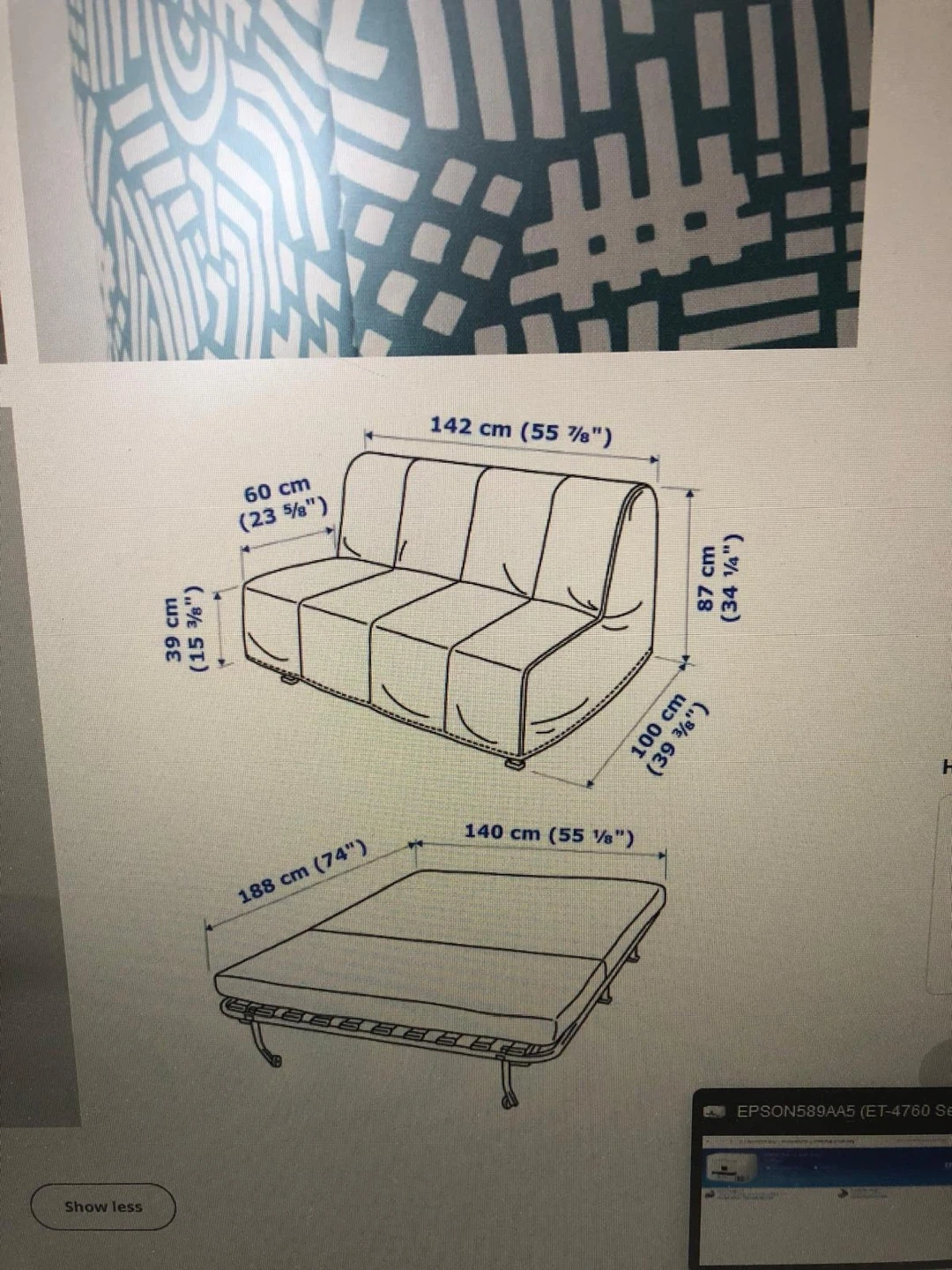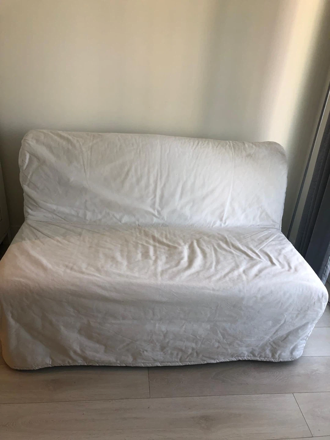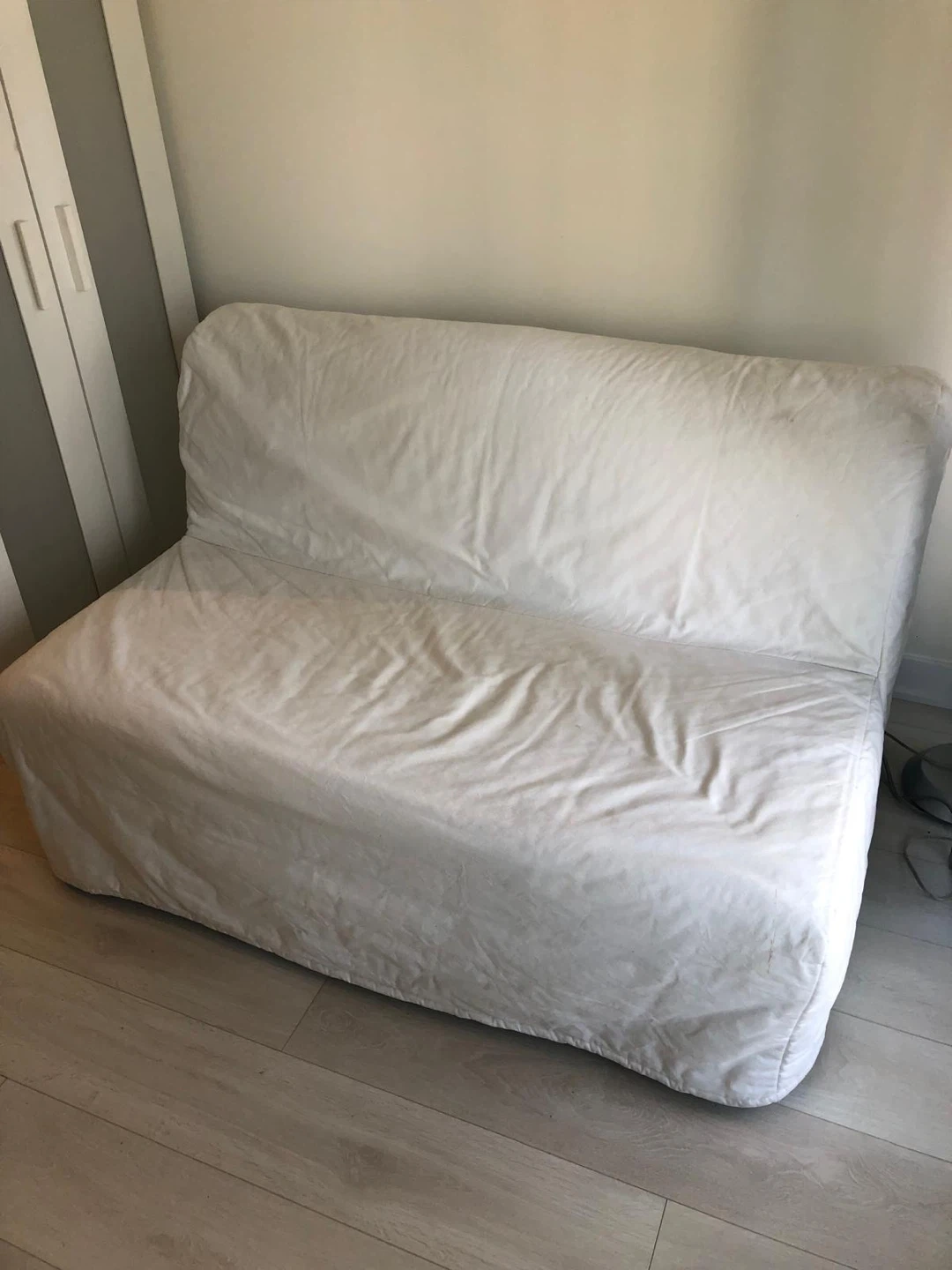 Selling an IKEA Lycksele Lövås sofa bed with a white cover! It's in good condition and perfect for small spaces or a guest room. Pick up only! Dimensions: - Sofa: 142 cm (55 7/8") wide, 87 cm (34 1/4") high, 60 cm (23 5/8") deep - Bed: 140 cm (55 1/8") wide, 188 cm (74") long