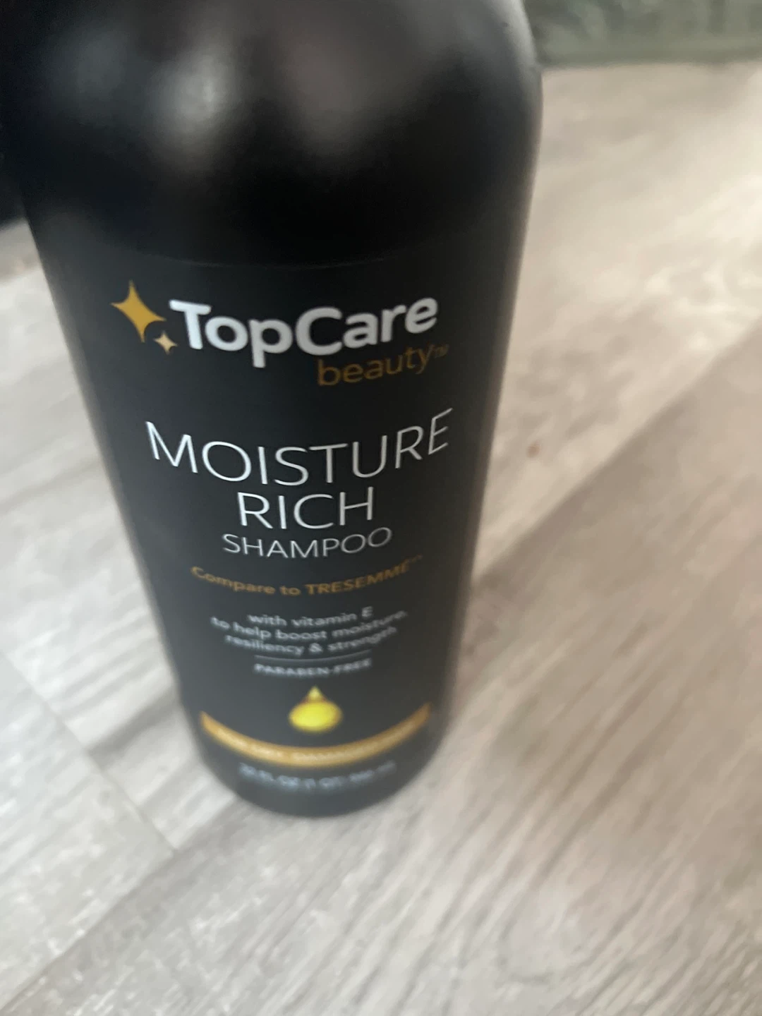 Top Care Beauty Moisture Rich Shampoo! It's designed to compare to TRESemmé. It's formulated with vitamin E to help boost moisture, resiliency, and strength. This shampoo is also paraben-free and is for dry, damaged hair