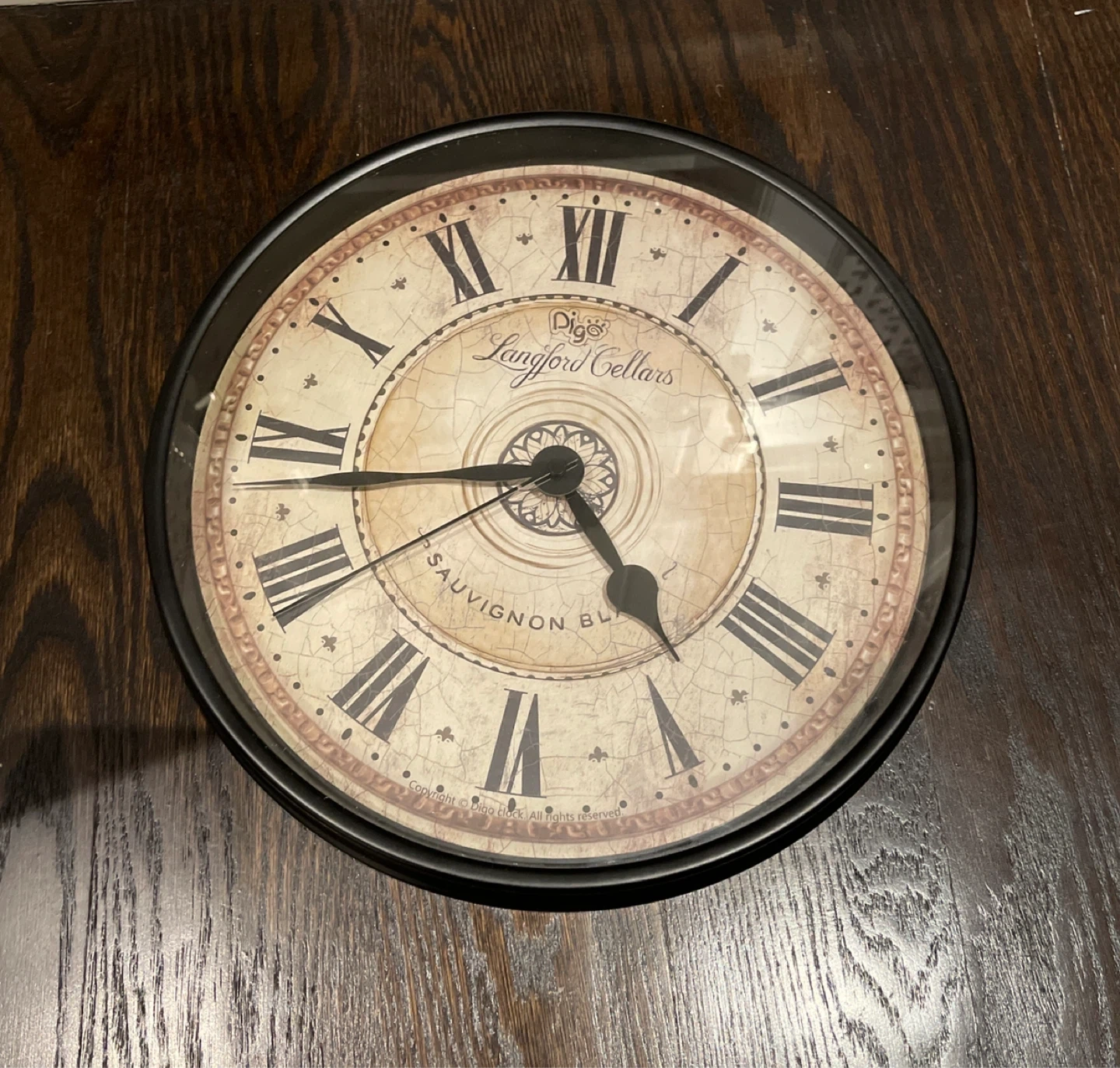 165A decorative wall clock featuring Langford Cellars design! It has a black frame and a vintage-style face with Roman numerals Condition: excellent and flawless. Works perfectly Cash only No trade Pick up only
