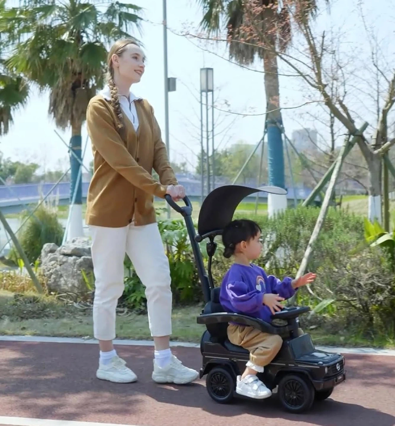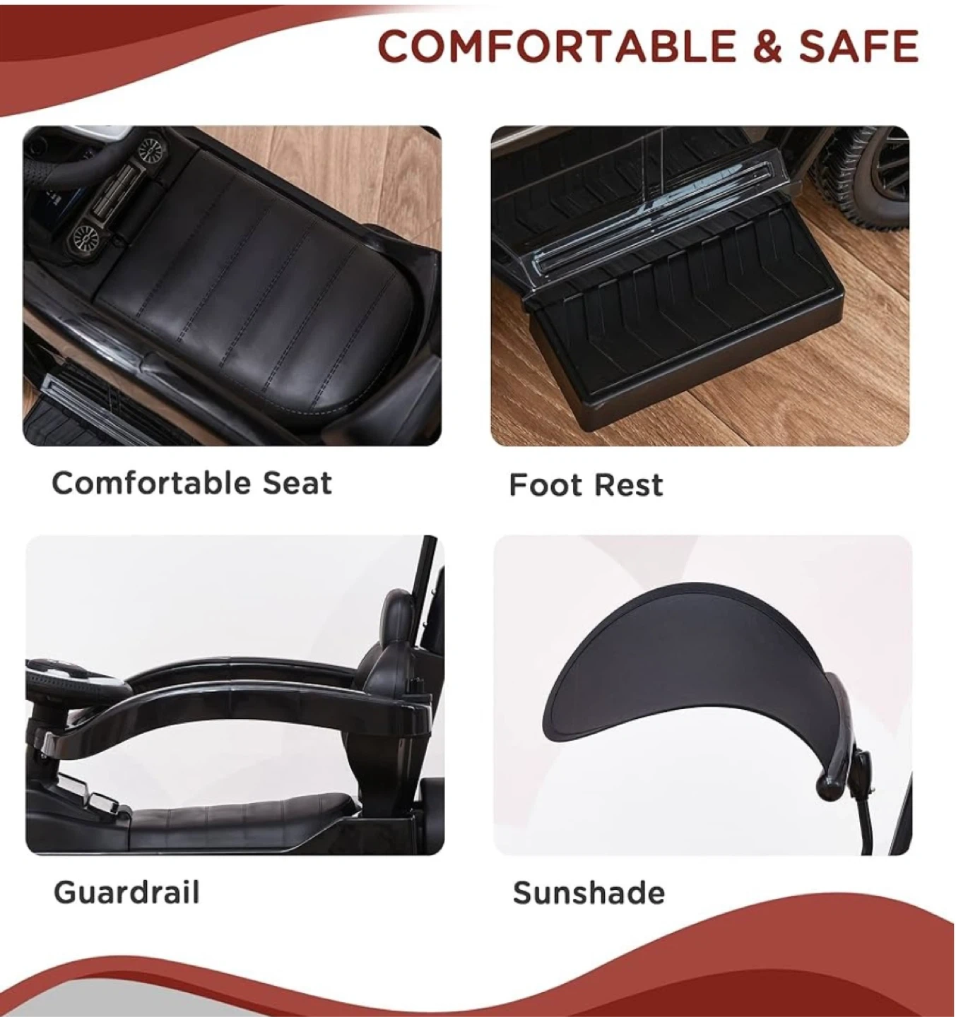 Comfortable & Safe: Comfortable seat with foot rest, guardrail and sun shade. Sculpted wheels for optimal traction. Integrated steering control system.