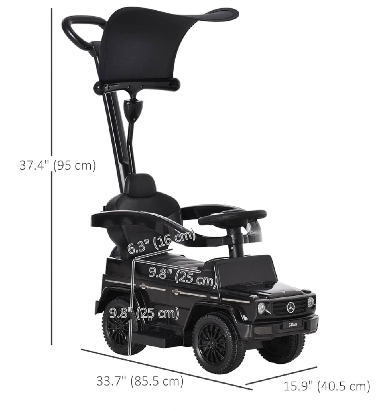 Baby Car Information: Overall Dimension: 33.7" L x 15.9" W x 37.4" H (85.5 x 40.5 x 95 cm), Seat height: 9.8" (25 cm), Suitable age: 18-36 months old, Weight capacity: 55 lbs (25 kg).