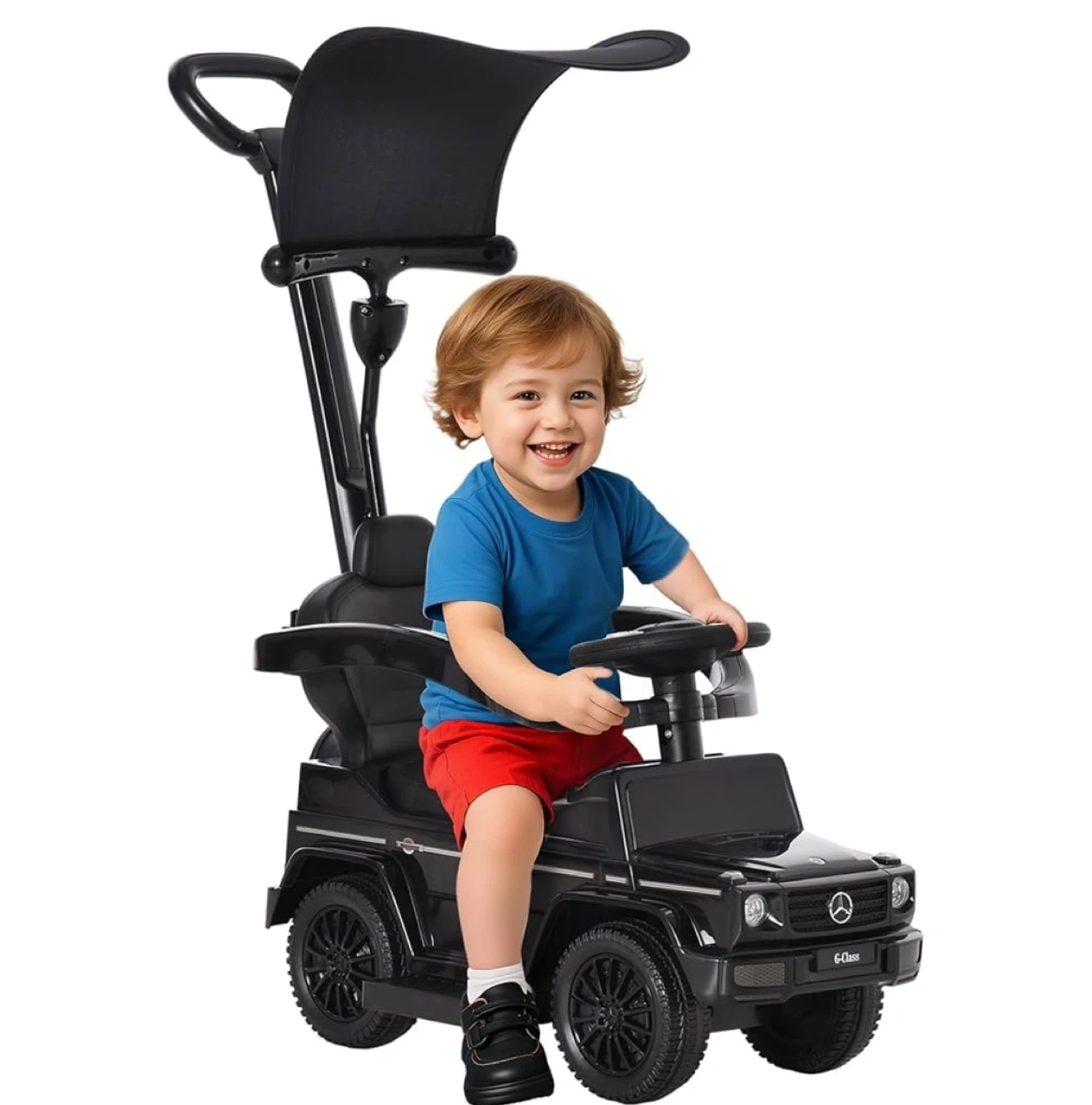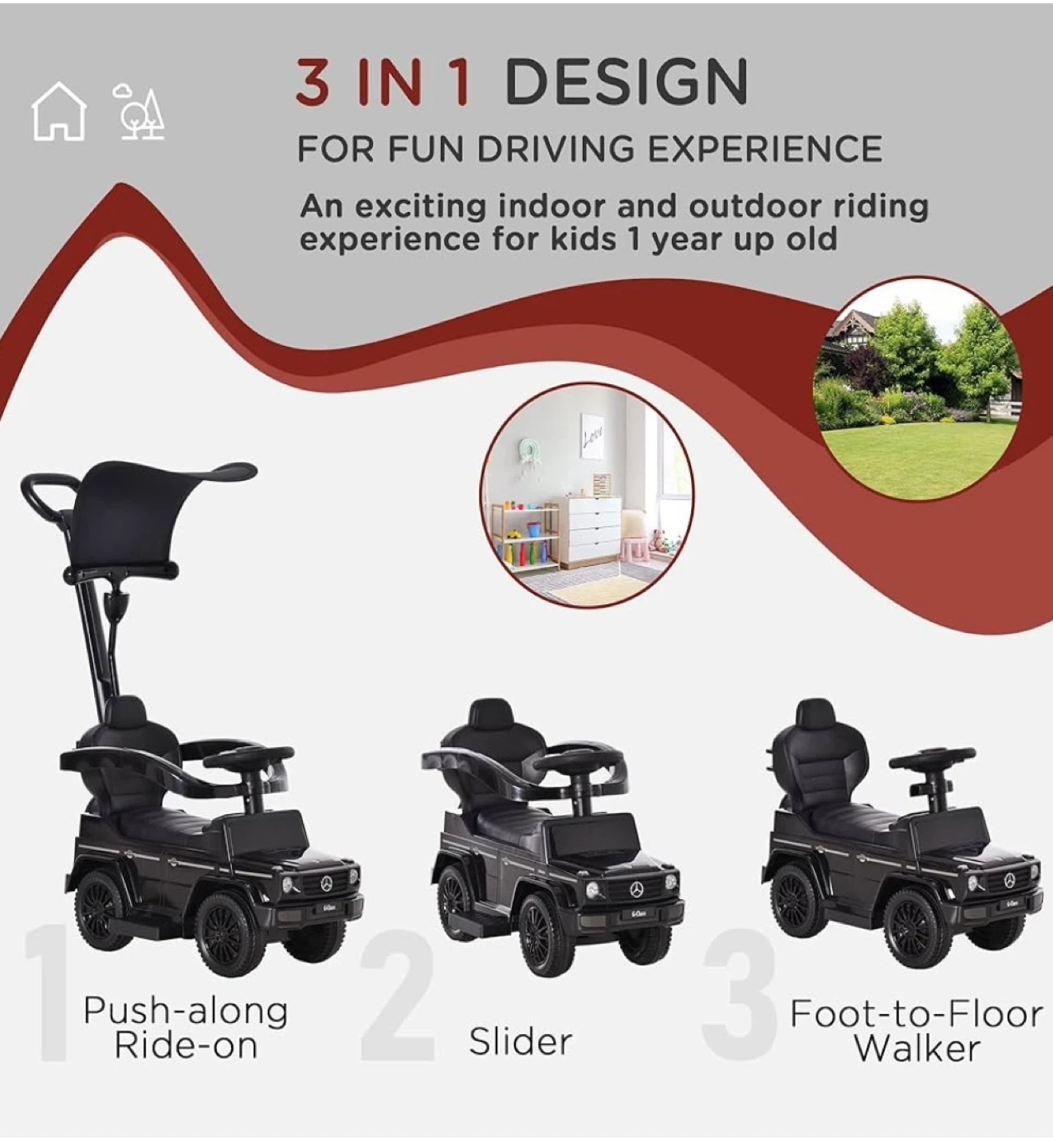 Fun Driving Experience for New Riders: Featuring detachable footrests and in the style of the real Mercedes-Benz G350, this ride-on sliding car provides children aged 18-36 months old an exciting indoor and outdoor riding experience.