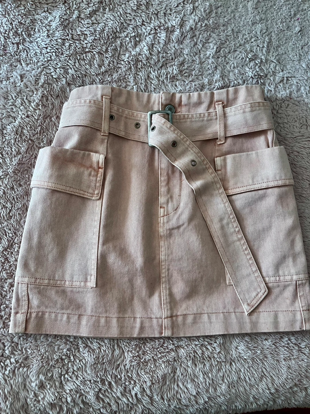 Forever 21 mini skirt in pale pink. It's a size small and features a belted waist and pocket details. Perfect for a casual outfit. There is some discoloration in the front, on pocket because it’s pink denim, but it’s still cute. Very, very short though.