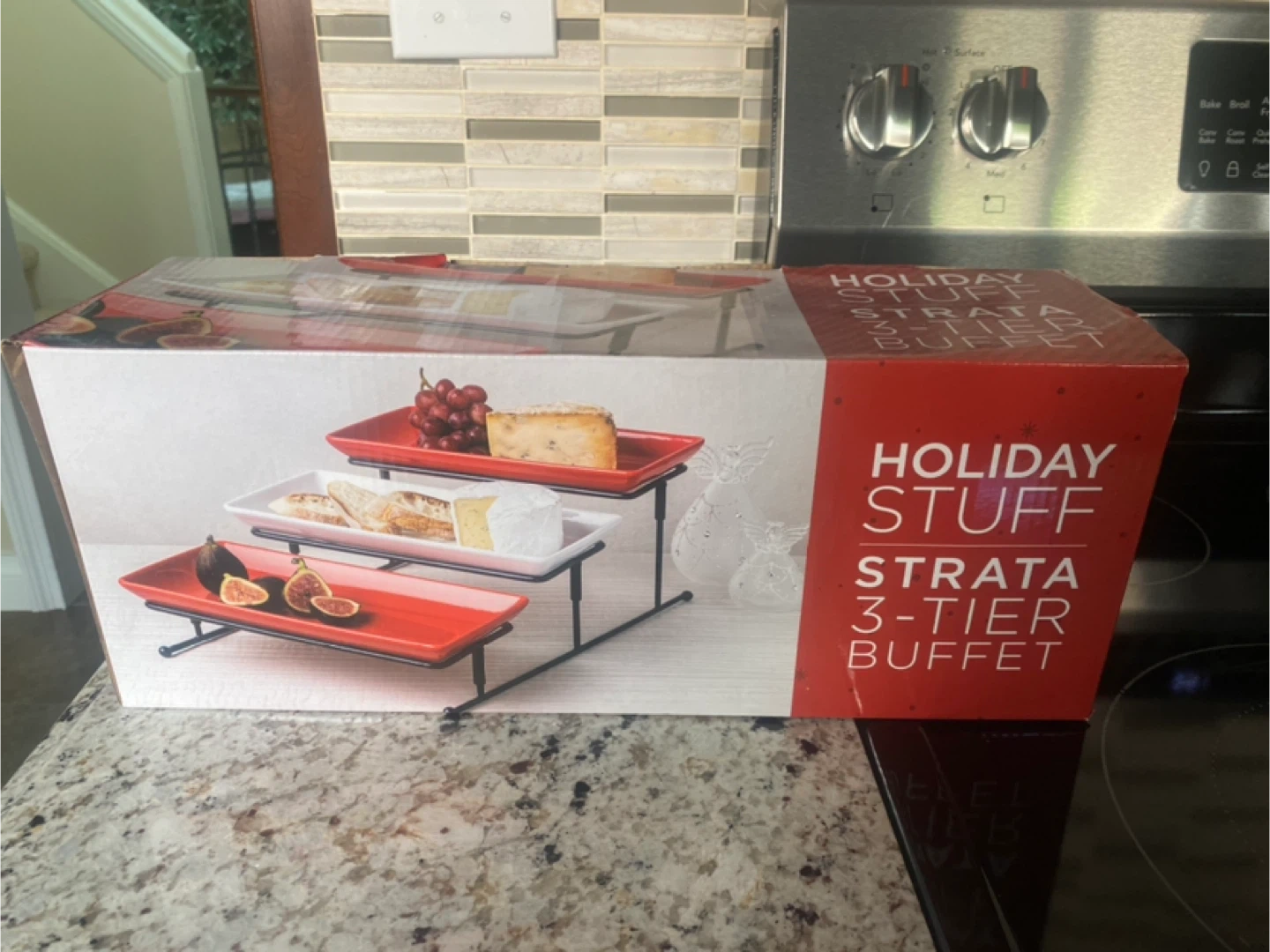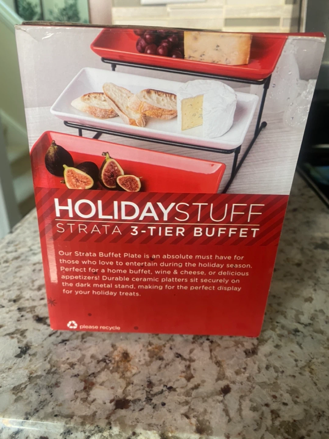 This Holiday Stuff Strata 3-Tier Buffet is perfect for entertaining during the holiday season! It's ideal for displaying a home buffet, wine and cheese, or delicious appetizers. The durable ceramic platters sit securely on the dark metal stand, making it the perfect display for your holiday treats 2 pickup locations available in Rexdale and Bolton. Let me know which works for you