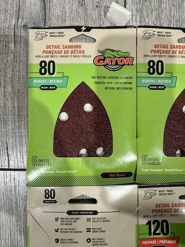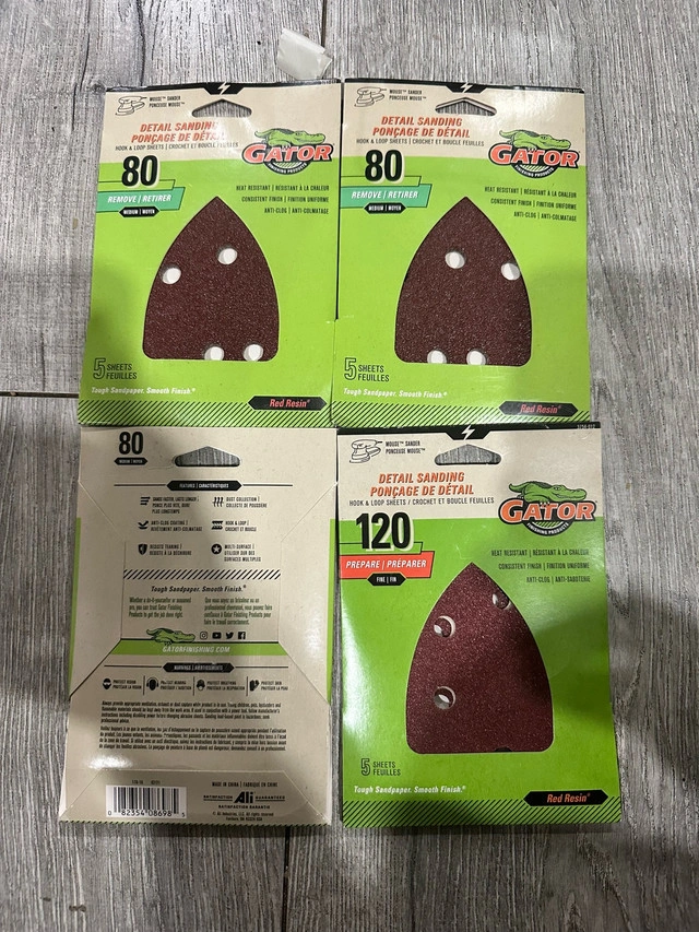 I'm offering new Gator 80-grit medium detail sanding sheets, designed for mouse sanders. Each pack contains 5 hook and loop sheets, perfect for detailed sanding projects. * 80 Grit * Medium * Hook & Loop * 5 Sheets per pack If the ad is up, they're ready to go!
