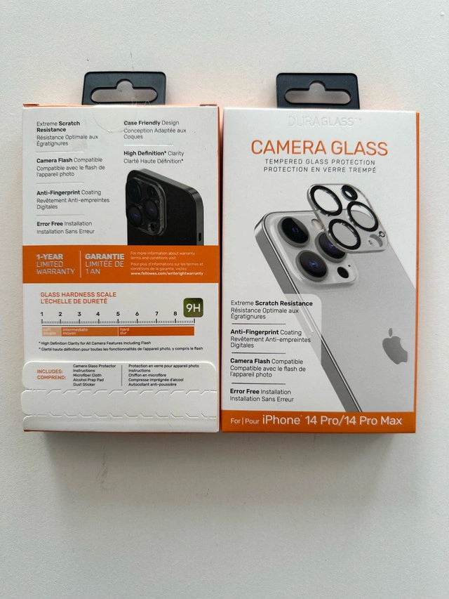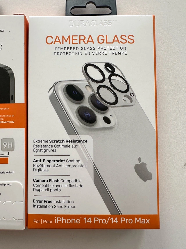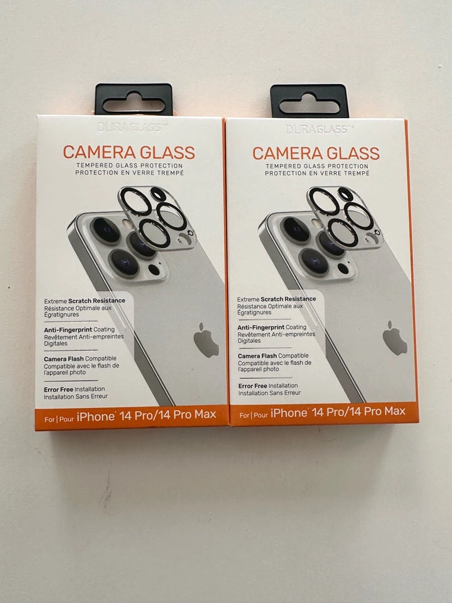 These are brand new Duraglass camera lens protectors for the iPhone 14 Pro and iPhone 14 Pro Max. They offer extreme scratch resistance and anti-fingerprint coating to keep your camera lens in pristine condition. The design is camera flash compatible to ensure optimal photo quality. Installation is error-free, making it easy to apply. If the ad is still up, it's available! $18 each more than 5 available