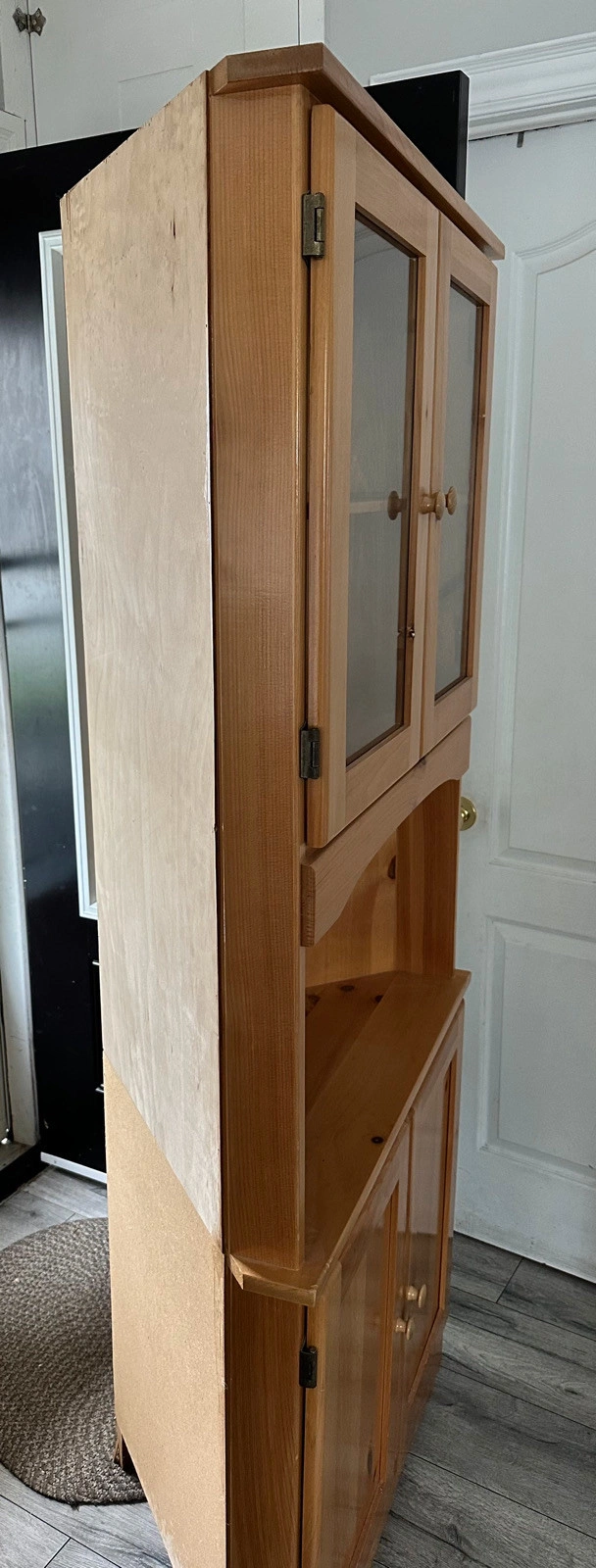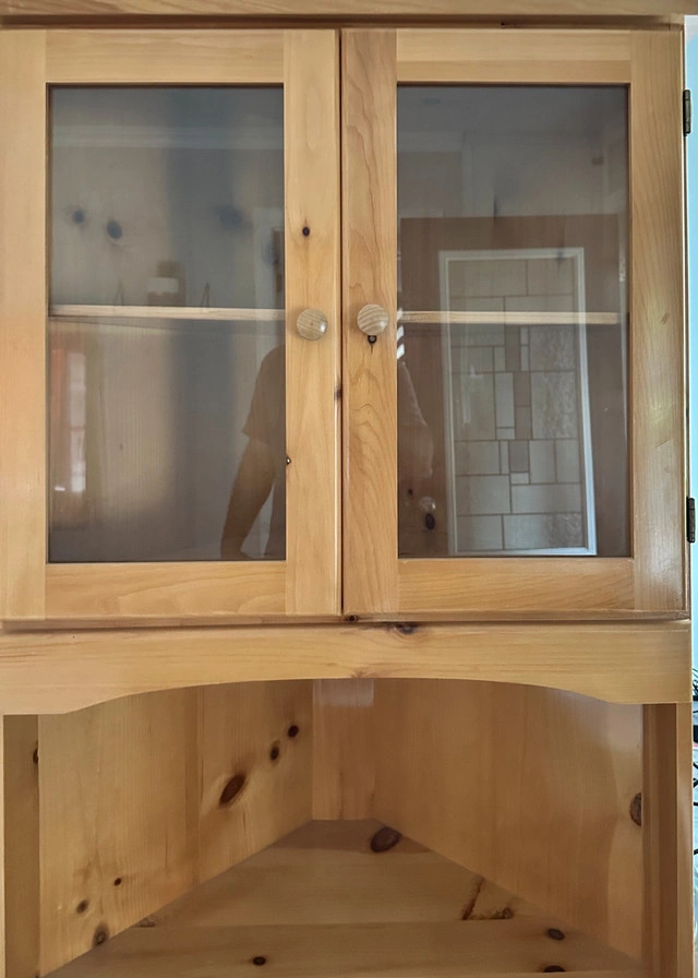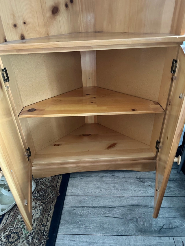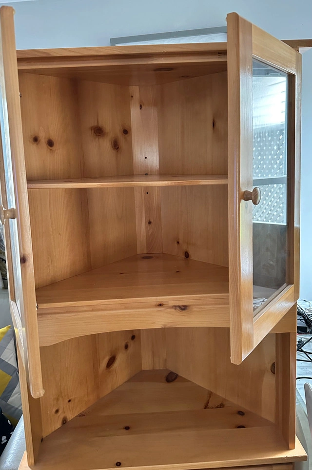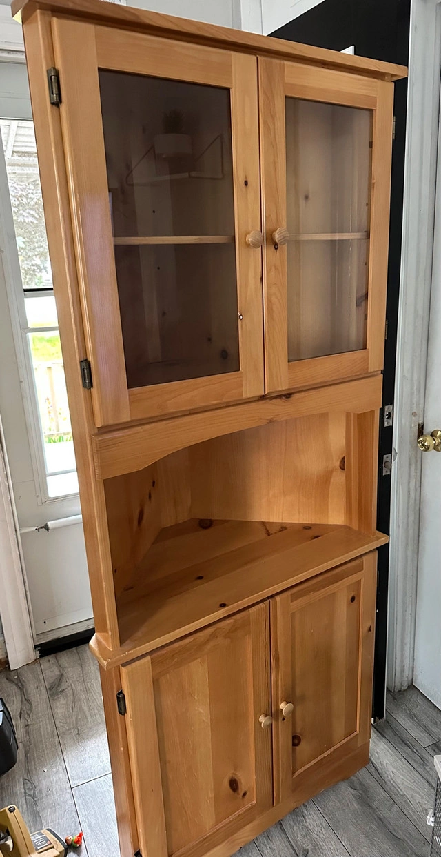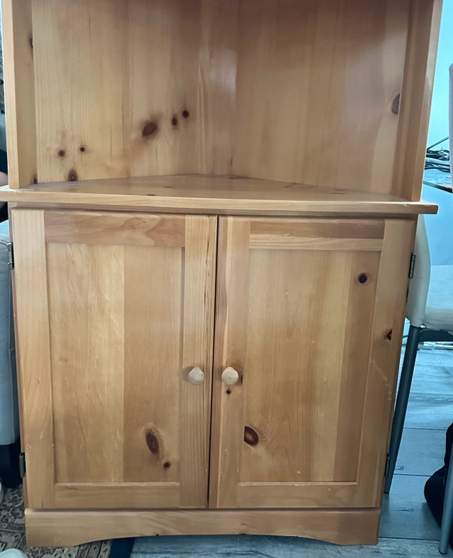 This corner cabinet is perfect for adding a touch of rustic charm and extra storage to any room. With its glass door display and lower cabinet, it offers both style and functionality. The cabinet is in good condition and ready to enhance your home decor. Additional details: * Solid wood construction * Glass door display cabinet * Spacious lower cabinet * Classic design Looking to give this lovely cabinet a new home! If the ad is up, it's still available!