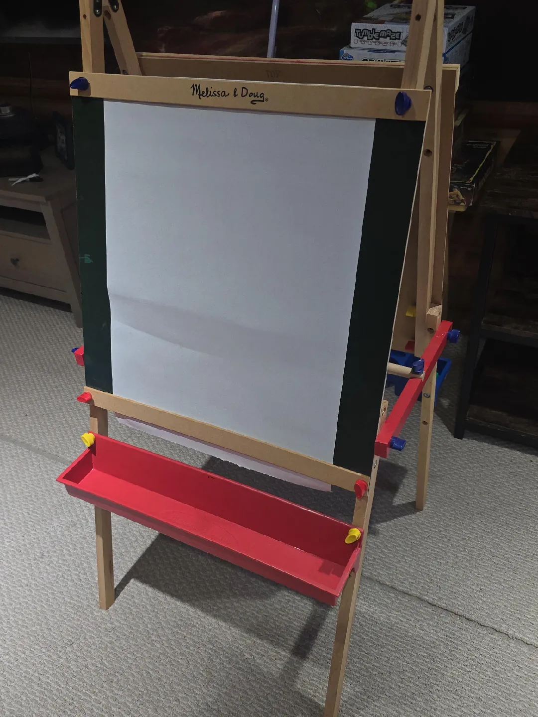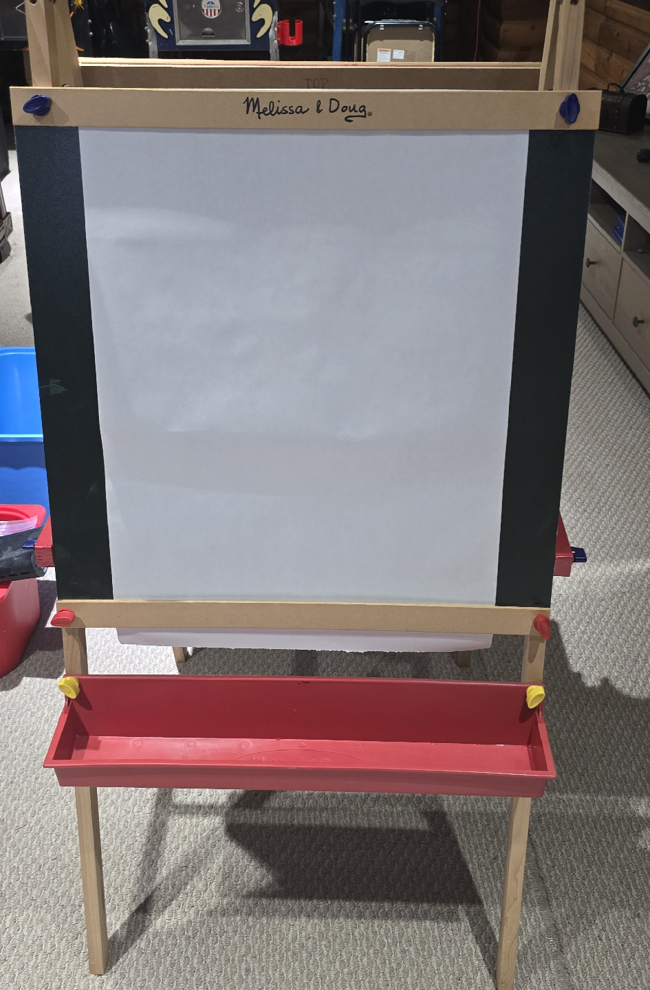 Selling a Melissa & Doug easel! It's in great shape and ready for a new artist. Perfect for kids who love to draw and paint. It features a whiteboard on one side and a paper roll for drawing on the other, plus a tray for holding art supplies. It was mostly used for football pools and party games.