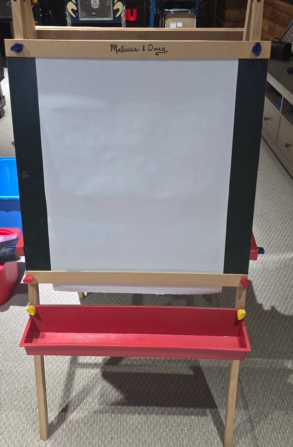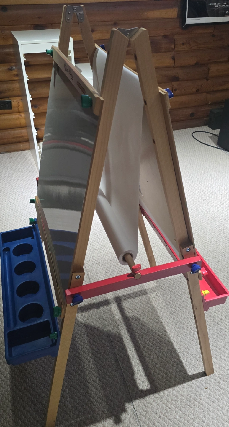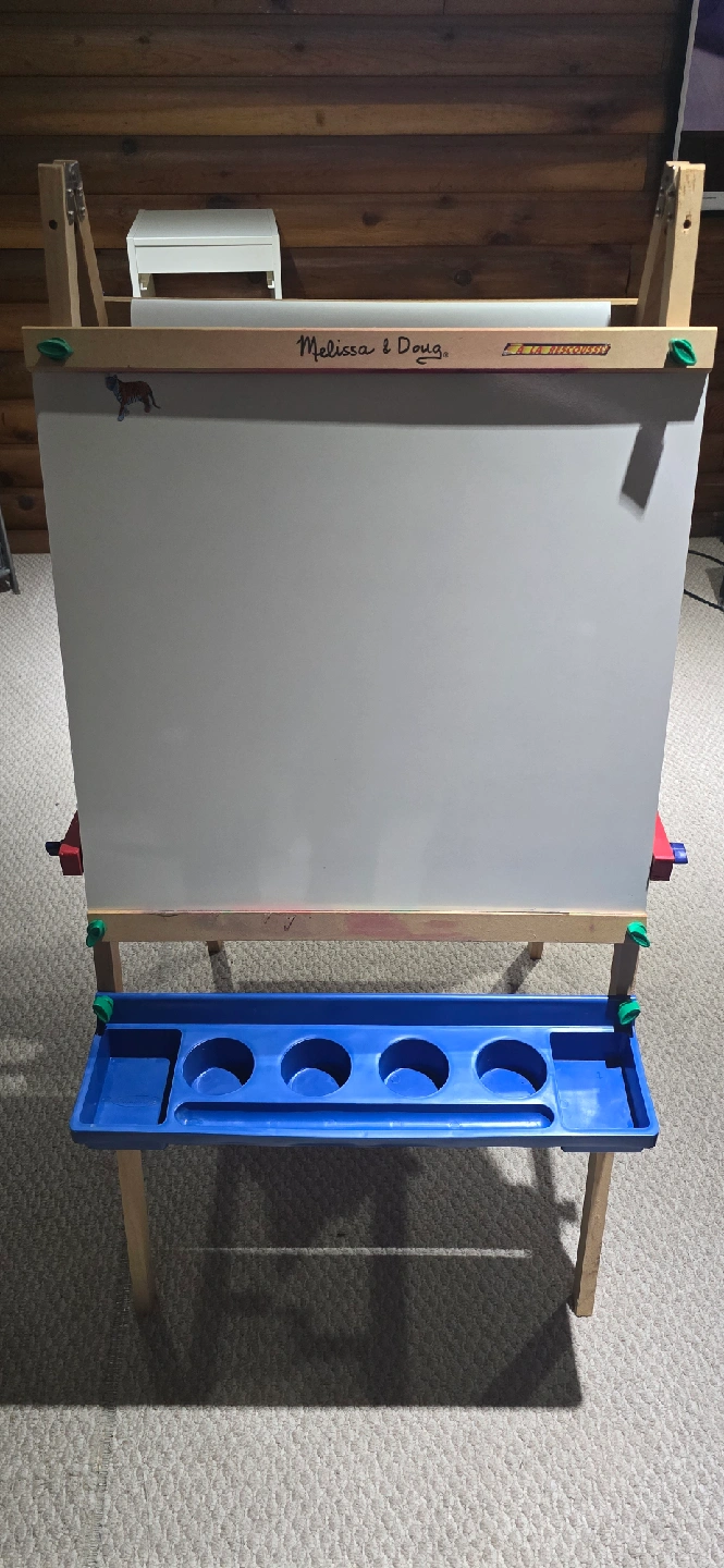 Selling a Melissa & Doug easel! It's in great shape and ready for a new artist. Perfect for kids who love to draw and paint. It features a whiteboard on one side and a paper roll for drawing on the other, plus a tray for holding art supplies. It was mostly used for football pools and party games.