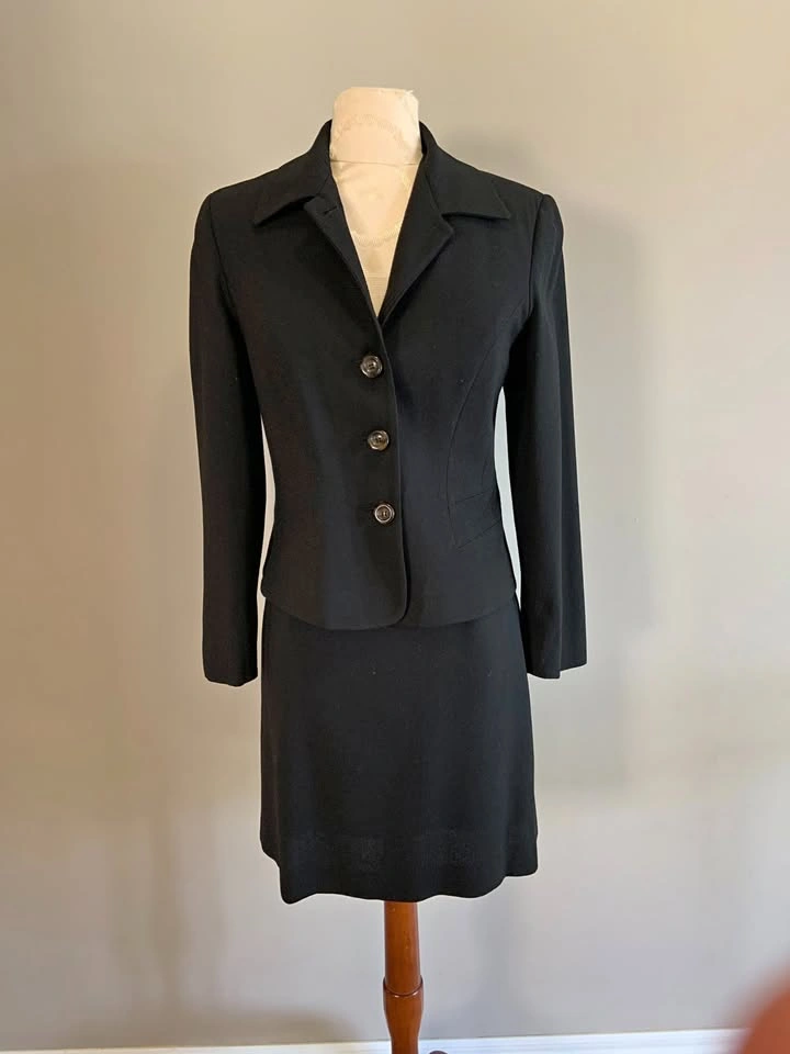 43This gorgeous suit is very flattering and perfect for the cooler fall and winter months. In like new condition as it was stored with a plastic bag/wrap around it and worn only a few times. I have several other suits posted, so take a look! - 100% Virgin Wool - Has lining - Has shoulder pads - Amazing Quality