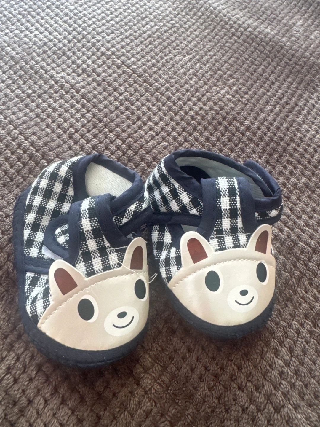 Super cute baby shoes featuring a charming bear design! These shoes are in great condition and perfect for keeping your little one's feet cozy and stylish. They have a black and white checkered pattern and a sweet bear face on the front. Ideal for infants!