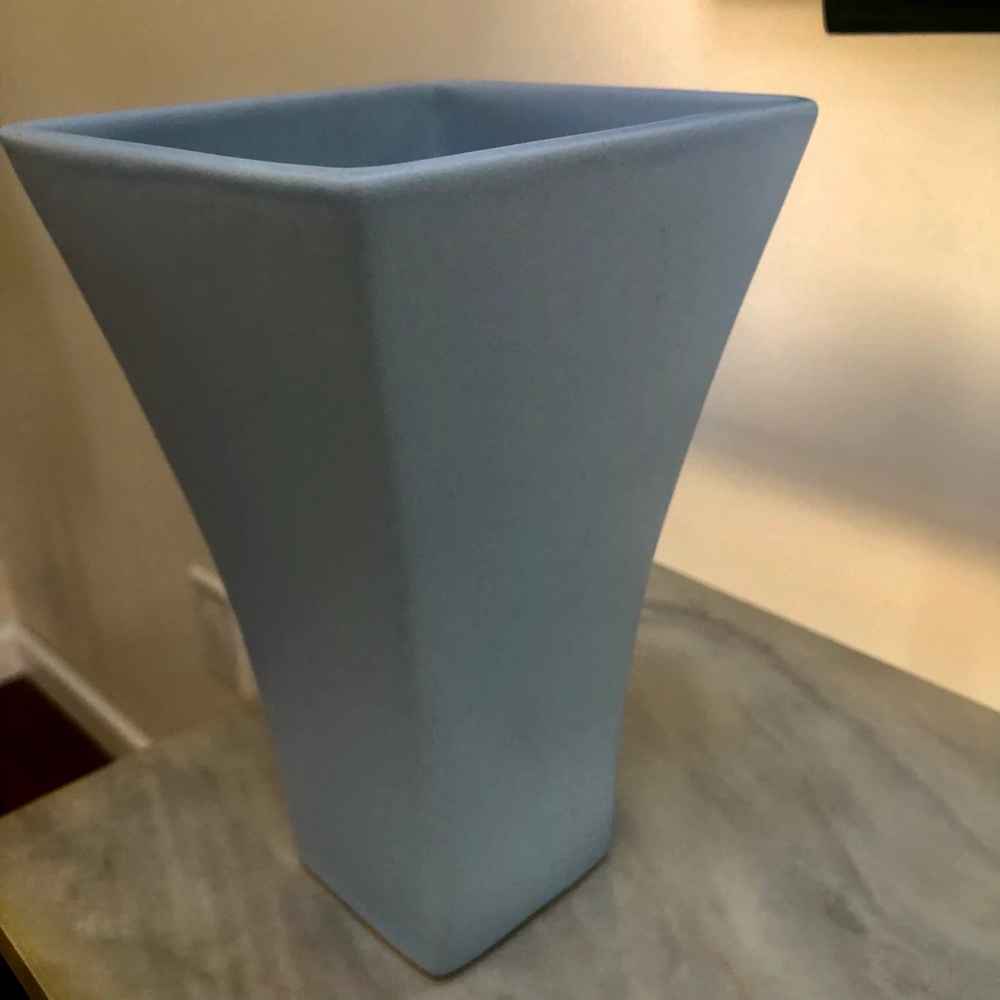 I'm selling a blue square vase. It's a simple yet elegant piece that can add a touch of color to any room. Perfect for displaying flowers or as a standalone decorative item