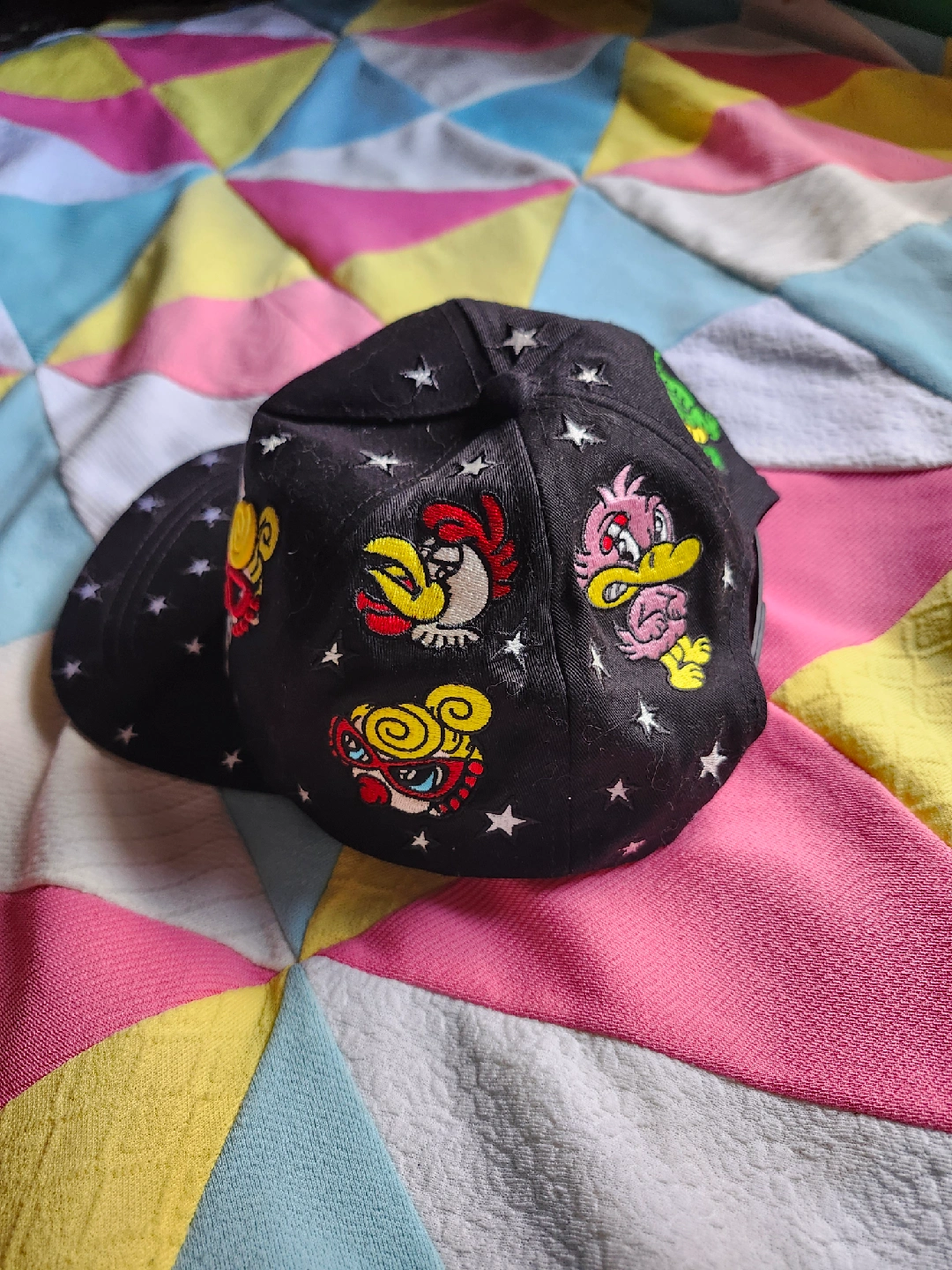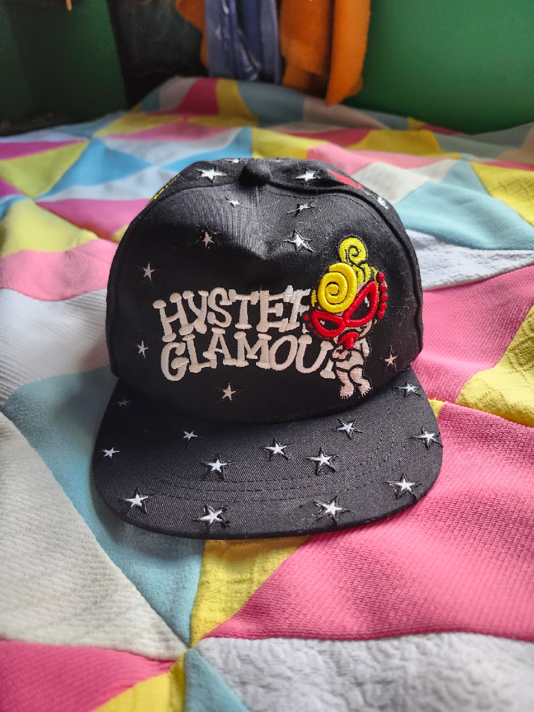 75super cool Hysteric Glamour Hysteric Mini (kids) snapback hat! can fit adults too, just not large heads. has tons of characters all around the hat item is in good used condition with no flaws that I noticed