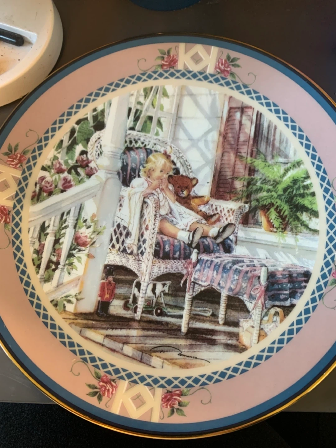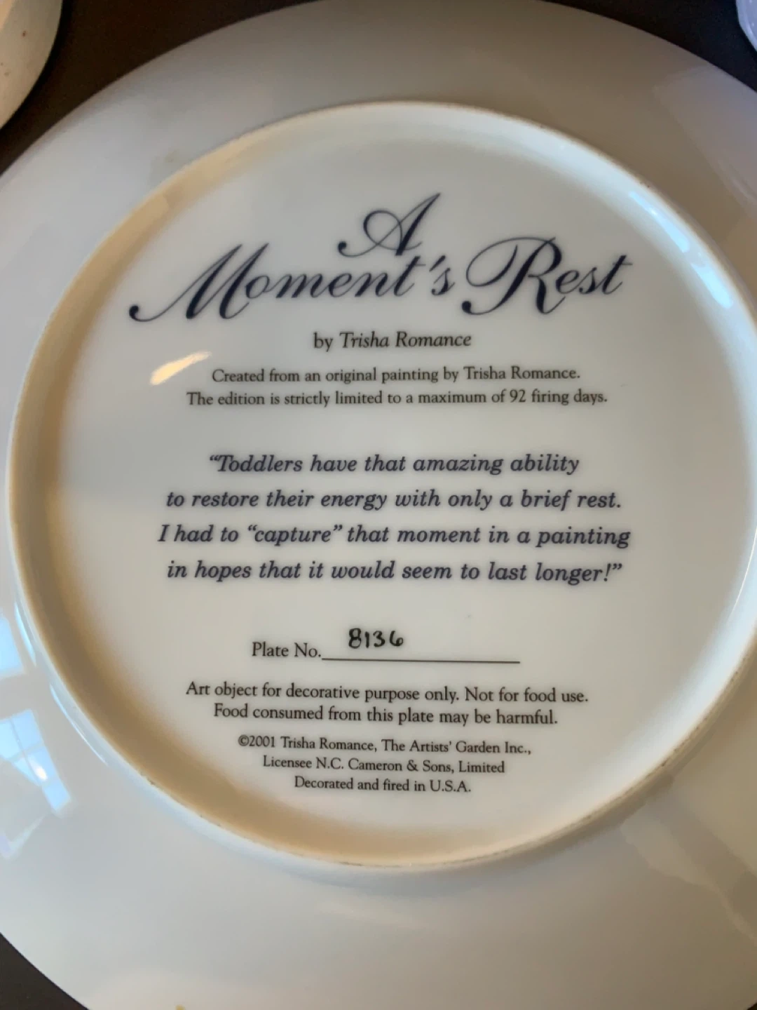 Selling a decorative plate titled 'A Moment's Rest' by Trisha Romance. The plate features a charming scene and is numbered 8136. It's a lovely art object for decorative purposes.