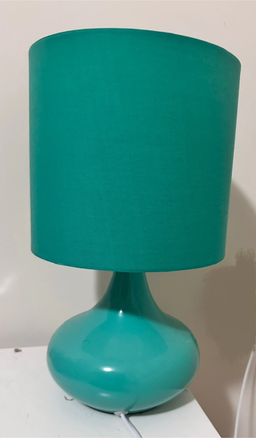 Selling a cute teal table lamp. It would be perfect for a bedside table or desk! The lamp is a vibrant teal, and it's in great condition. It has a unique shape that would add a touch of retro style to any room. The light turns on and off when you simply touch the body of the lamp. It has a Type G plug as well. We are open to selling two of the same lamp for 40$, if you want.