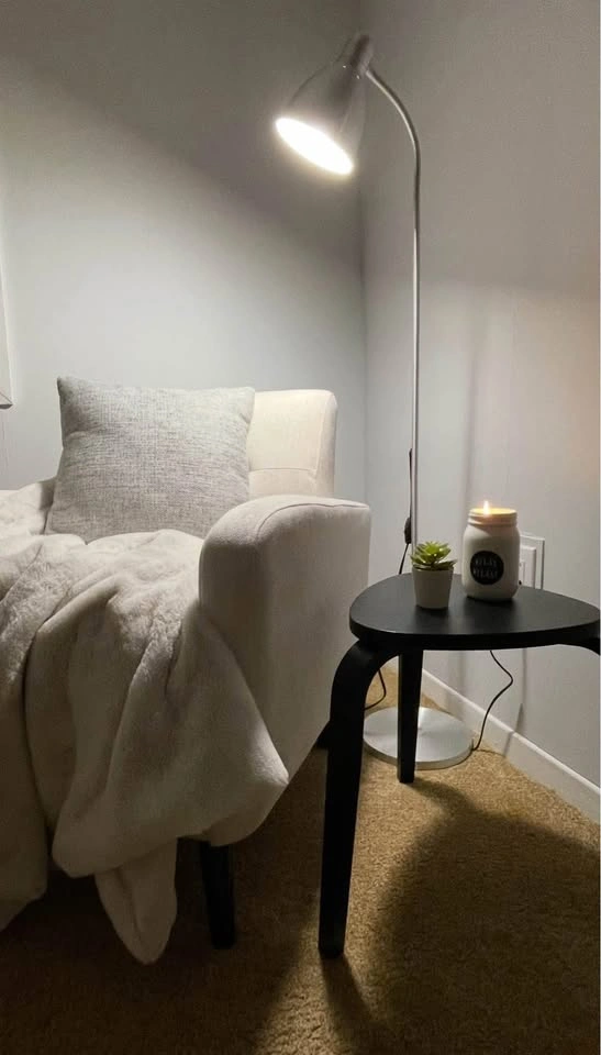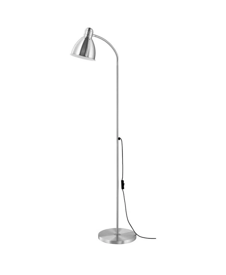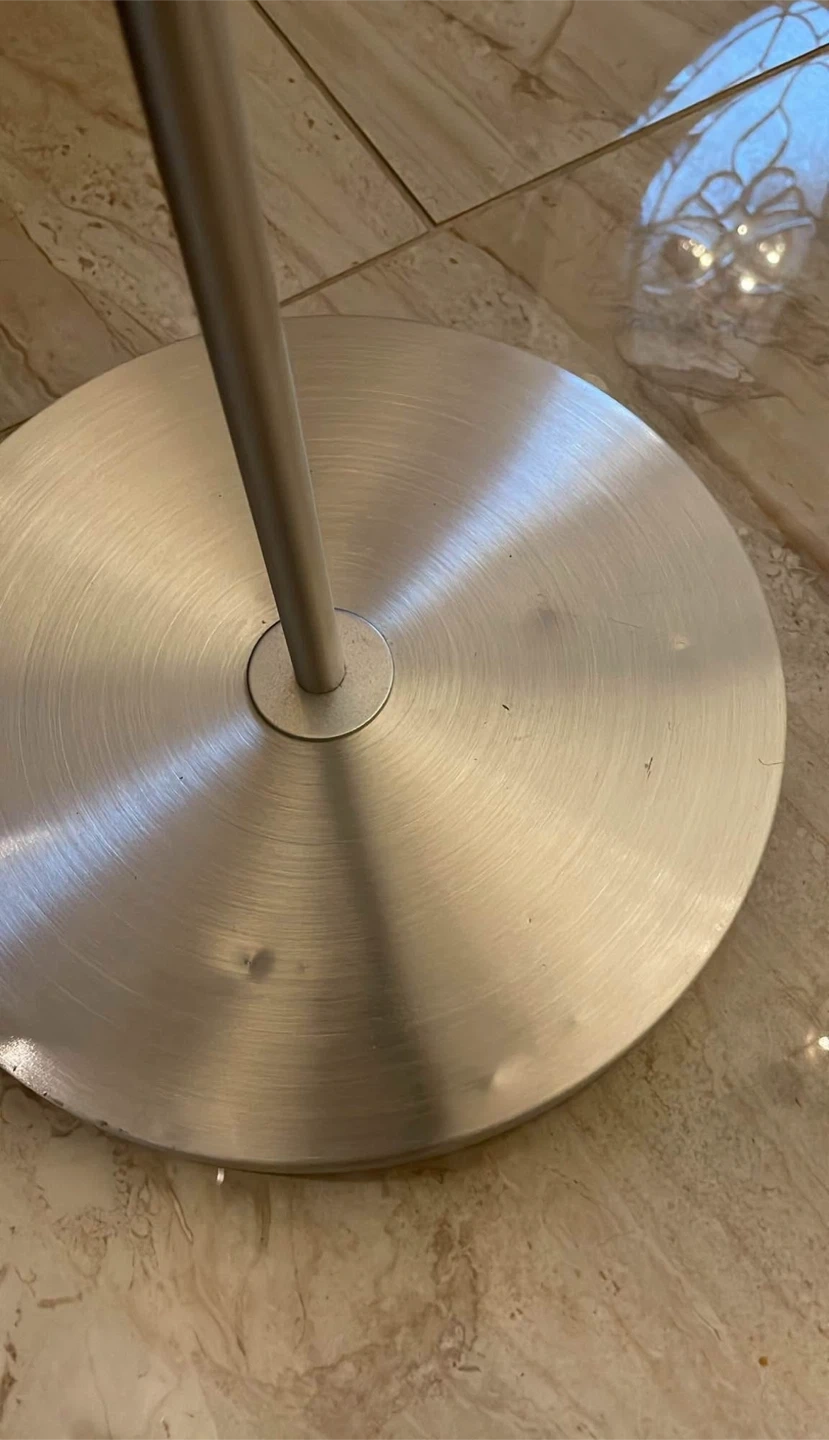 44This floor lamp in aluminum is perfect to have by the sofa or your favorite armchair. You can easily direct the lamp arm so you get the light exactly where you want it when sitting down to read. ***Base has dents—see picture for reference.*** Measurements: Max.: 13 W Height: 52" Base diameter: 10" Shade diameter: 6" Cord length: 6'7"