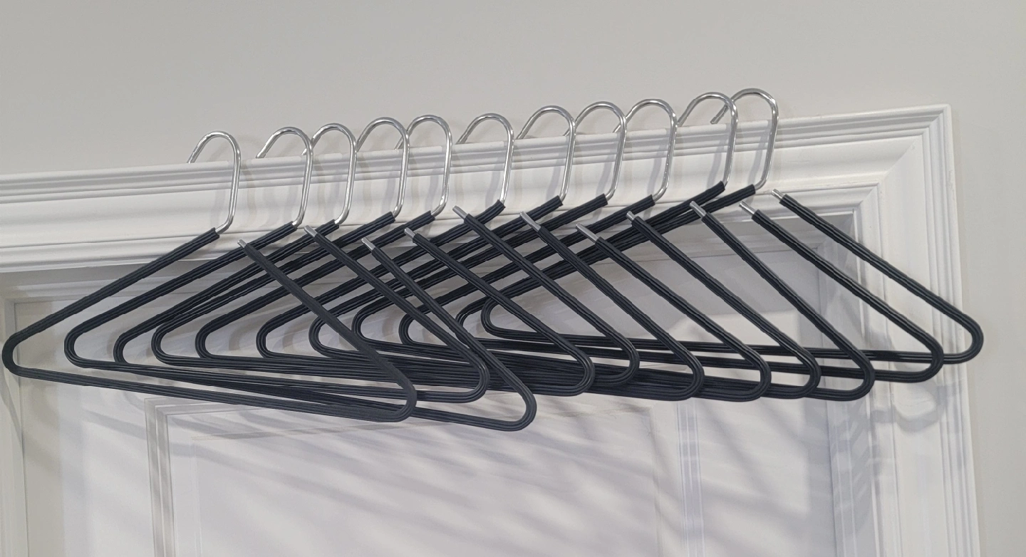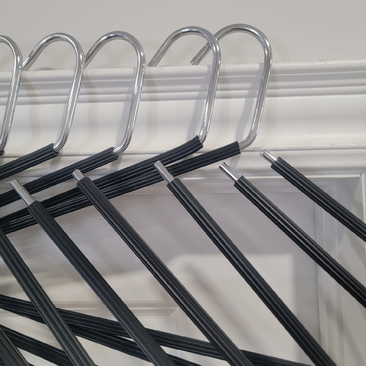 11 SS clothes hangers with a black cover to maintain shape and prevent creases. As new. Clean.