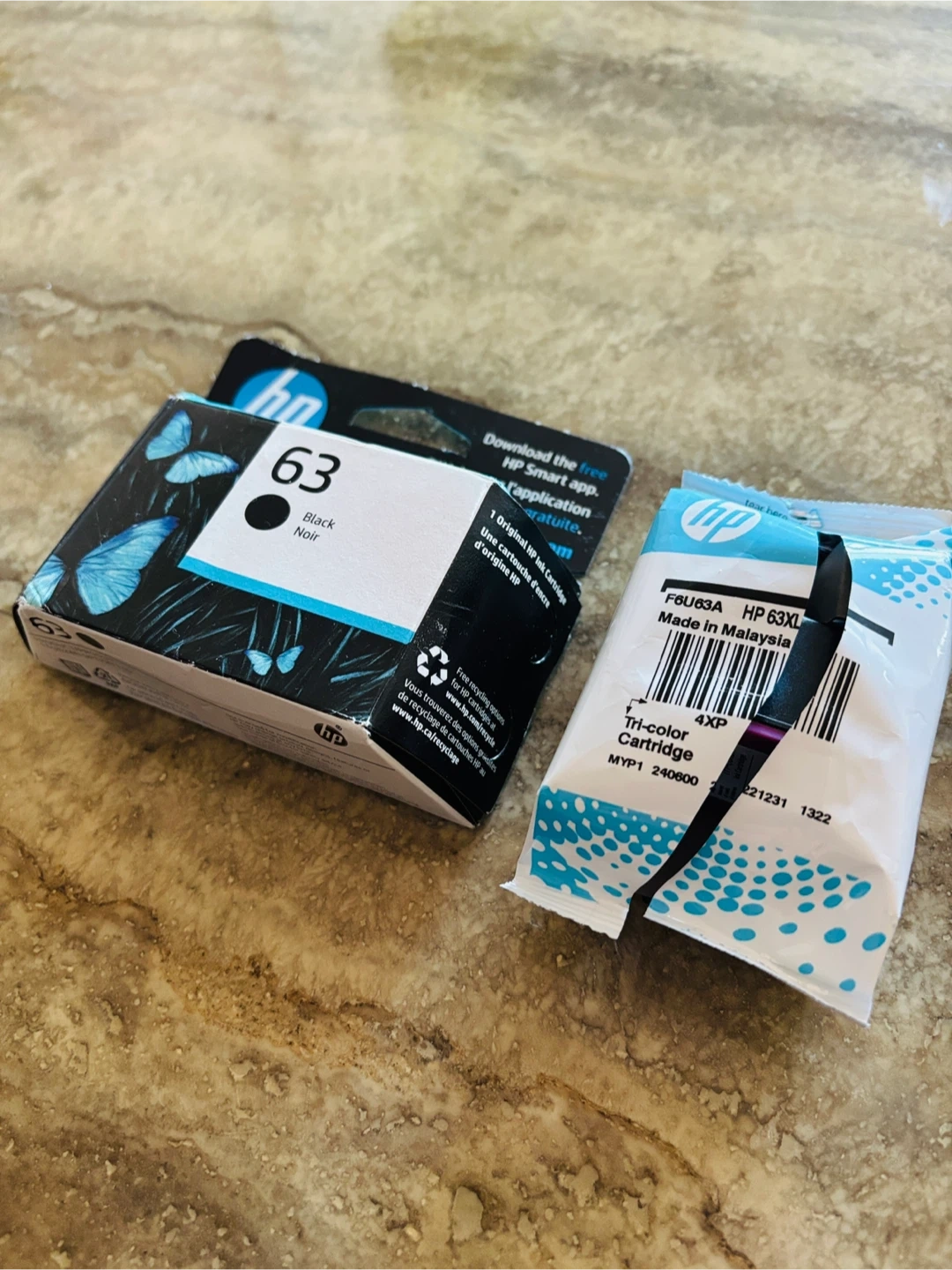Selling HP 63 black and 63XL tri-color ink cartridges - HP 63 Black Noir - HP 63XL Tri-color Cartridge Both are genuine HP ink cartridges Were $142 with tax.