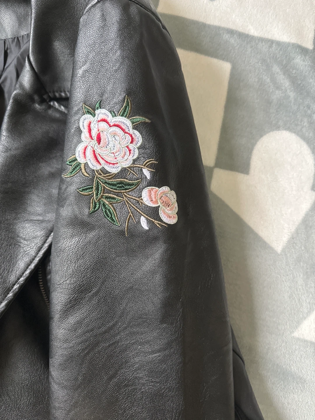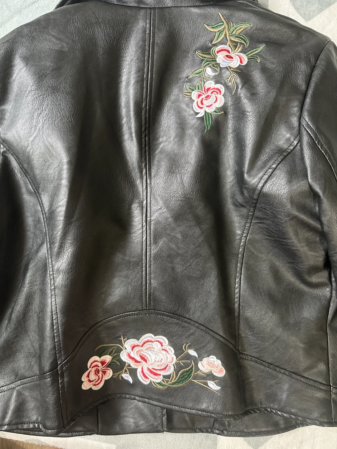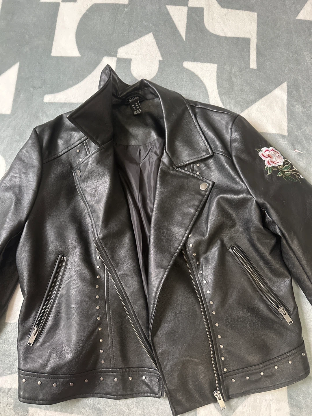 Streetwear Society black faux leather jacket in size XL! It features a stylish biker design with silver stud details and beautiful floral embroidery on the sleeves and back. Perfect for adding a bit of edge to your outfit!