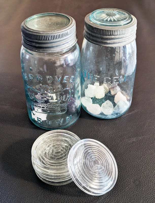 If you are seeing this Ad, then this item is still available This sale is for 4 very nice Vintage Glass Canning Jar Lid - 2x Crown, 2x Unmarked. Note: Jars in photo are for demonstration only and not for sale. Pick-up in Pickering ONLY This item comes from a smoke-free home.