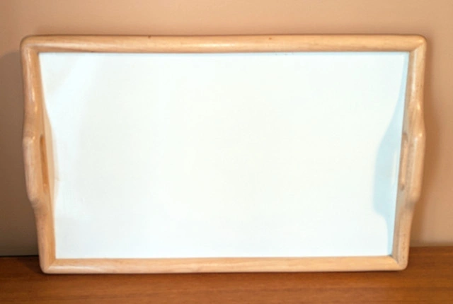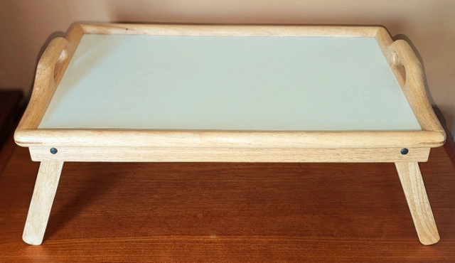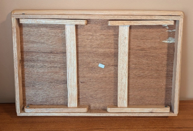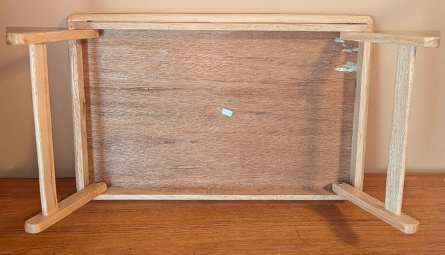 If you are seeing this Ad, then this item is still available This sale is for 1 group of very nice and clean Wood Breakfast Bed Tray with Handle Foldable Legs. Make serving a meal easy with the multi-functional Wood Serving Breakfast Tray. An essential item for any household. It is finely crafted of solid wood and features a beautiful natural wood finish with a white surface that will blend with almost all decor styles. Easy to carry with raised side handles and rim around the tray to help keep items from slipping off while transporting on the tray. The white melamine surface is water-resistant to help protect against spills, making this durable and easy-to-clean. Ideal for breakfast or a meal in front of the TV, or as a convenient workspace for your laptop. This versatile tray is lightweight and sturdy. With foldable legs making it easy to store when not in use. Measures: 24" W x 14" D x 10" High when legs are opened or 21.75" W x 14" D x 3.30" H folded Pick-up in Pickering ONLY This item comes from a smoke-free home.
