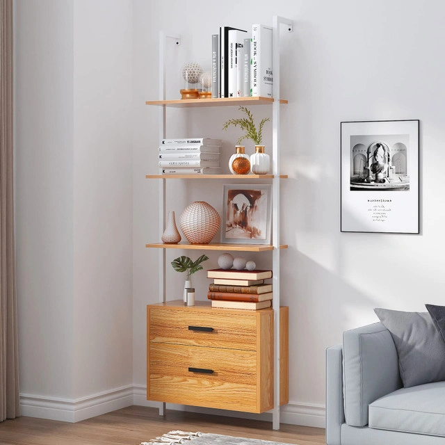 Brand New bookcase/Shelving unit. It comes unassembled in original box with all manufacturer parts, hardware, and instructions for easy assembly. Pickup from south London. I can deliver in London for an extra fee. SogesHome Industrial Wall-Mounted Ladder Shelf with 2 Drawers, 4-Tier Bookcase Bookshelf, Free Standing Display Shelf Storage Rack with Drawers for Living Room, Office, Bedroom, Kitchen, Teak Product details: Brand: SogesHome Model#: CZWK-SF03BL060 Material: Metal, Wood Mounting type: Wall Mount Shelf type: Ladder Shelf Number of shelves: 3 Special feature: Durable, Drawer 【Sturdy Ladder Shelf】: This ladder bookshelf adopts thicken wood broads and high-quality metal frames which made it have a stronger bearing capacity and a long using life. You could place books, flower pots, decorations, photo albums, or bags something you're favorite. 【Safe Wood Bookcase】: The wall-mounted design of this bookcase makes it possible to prevent the bookshelf from tipping over with screws on each side of the top metal frame to firmly fix it on the wall. With a slanted appearance presents, all shelf layers lean against the wall at an angle of 90°to ensure stable placement of items. Dimensions: 23.6L x 12.4W x 70.9H inch. Featuring 3-tier open shelves, it could place different decorations in layers. Equipped with 2 wood drawers on the bottom which is capable of satisfying your daily storage while keep your daily essentials and display decorations in order. Wood board combined with black metal frame, this modern industrial bookshelf will add endless charm to your display space. And the open design, allowing you to have a panoramic view of the items on the open shelf, which is convenient to put and take. With a simple and modern design, this open storage rack could complement a variety of home decorations as a bookcase, bathroom cabinet and storage rack in your living room, bedroom, kitchen, balcony, office, corridor.