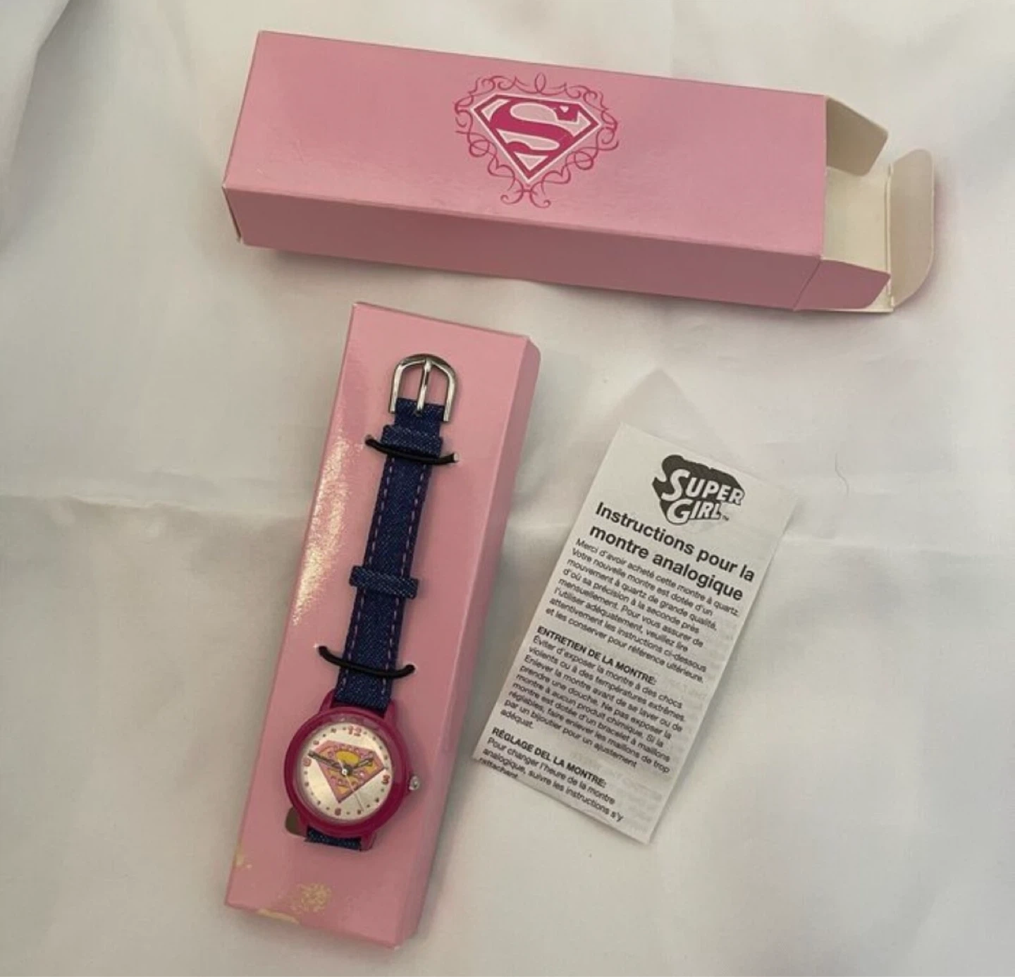 Adjustable denim strap with Supergirl logo and pink rhinestones on the watch face. Includes box and all original packaging.