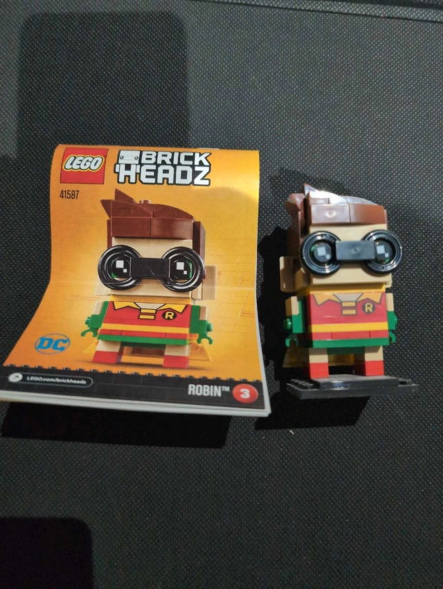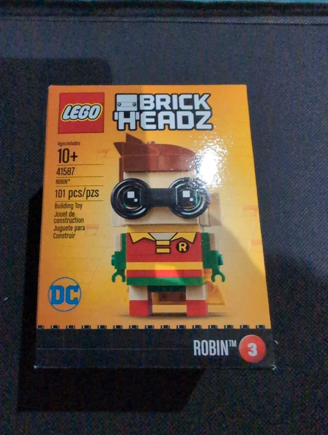 42Selling a used Lego Brickheadz Robin set, number 41587, with 101 pieces for ages 10+. It's a fun building toy to construct! This set has been previously enjoyed, but is still in good condition, ready for a new home. Includes the original box and instructions. Model Number: 41587. Theme: DC Comics, Batman. Number of Pieces: 101. Recommended Age: 10+. If you see this ad, the item is still available!