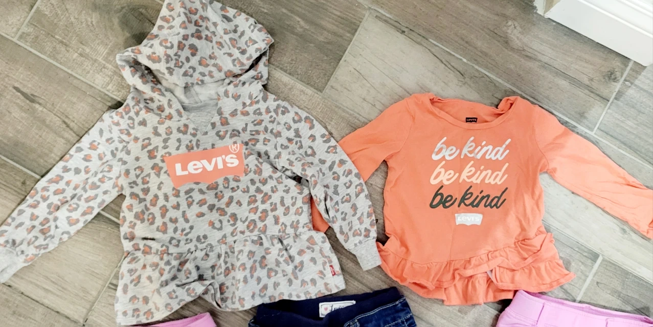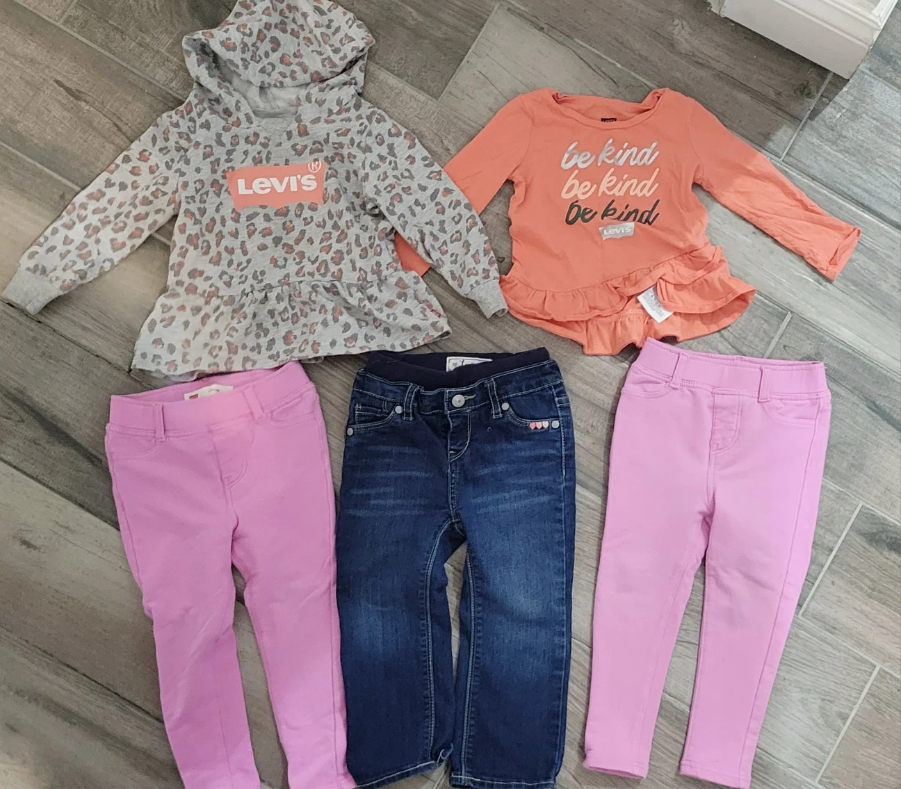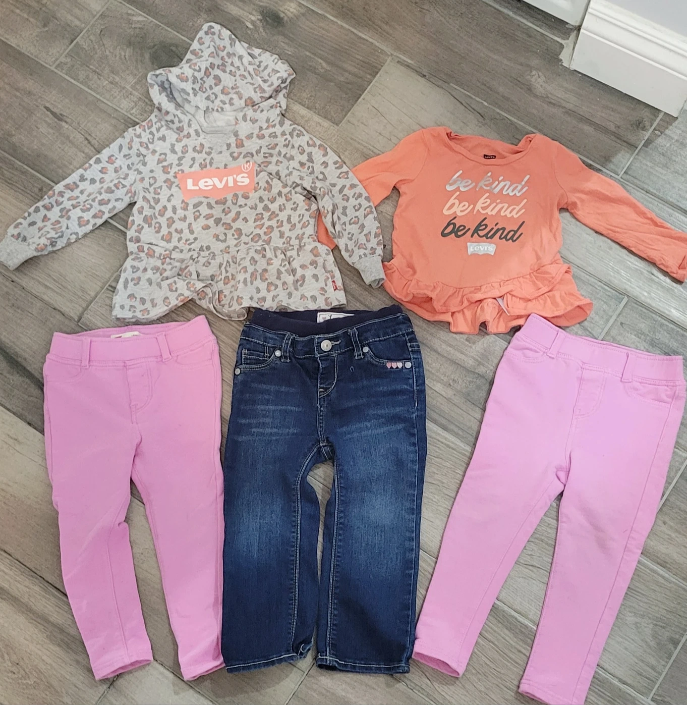 3 pairs of LEVIS pants. 1 pair of denim jeans size 24months . 2 identical LEVIS baby pink leggings size 24months. 1 LEVIS long sleeve shirt size 18-24 months. 1 long sleeve LEVIS hooded sweatshirt size 18-24 months. ALL in GOOD AS NEW condition. RETAIL PRICE all together over $100. I'm selling all for $40 all together.