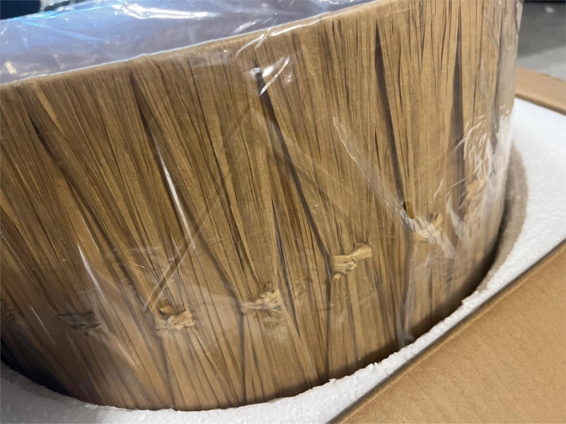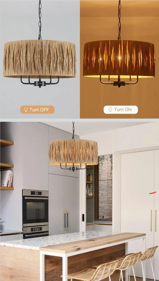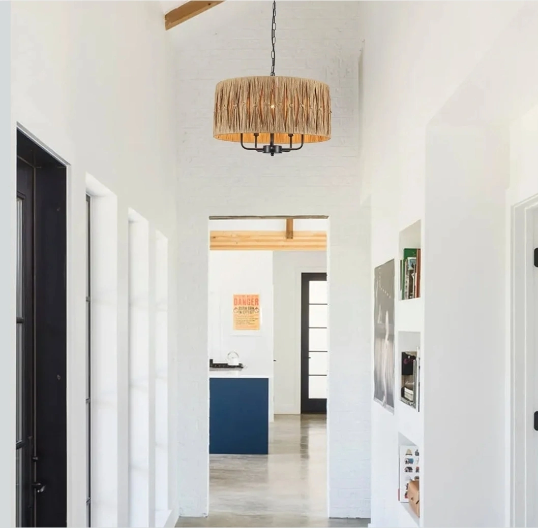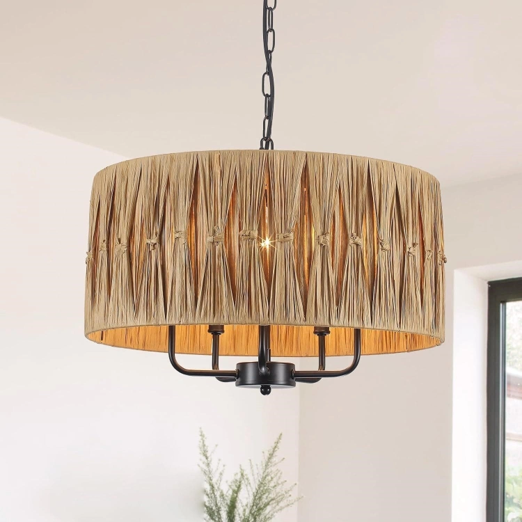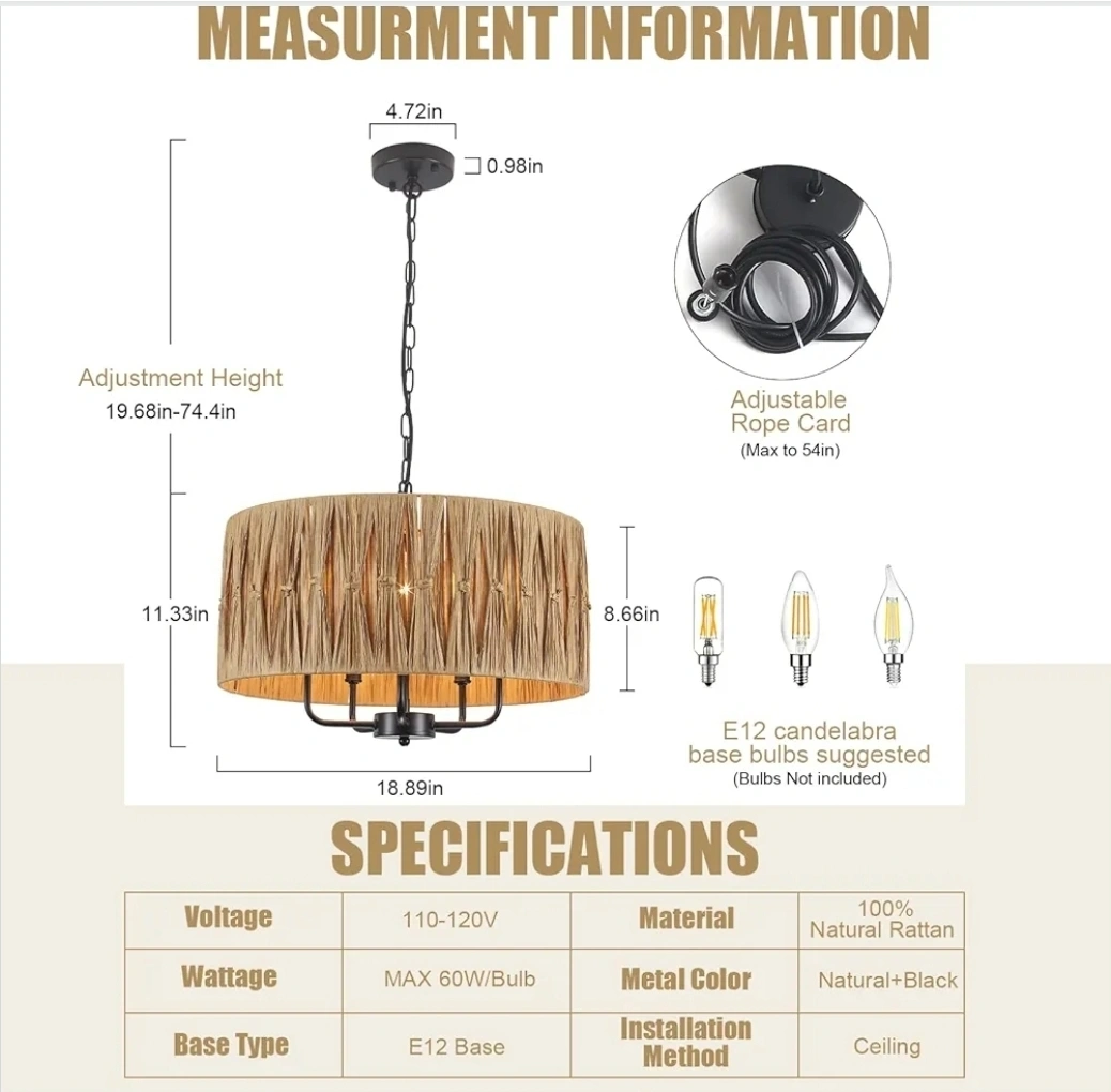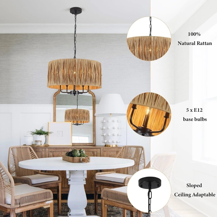 Add a touch of natural elegance to your home with this beautiful rattan drum chandelier! The shade is made of 100% natural rattan, paired with a sleek black metal frame. It uses E12 base bulbs (not included) and is adaptable to sloped ceilings. This chandelier is perfect for adding warm, inviting light to any room!