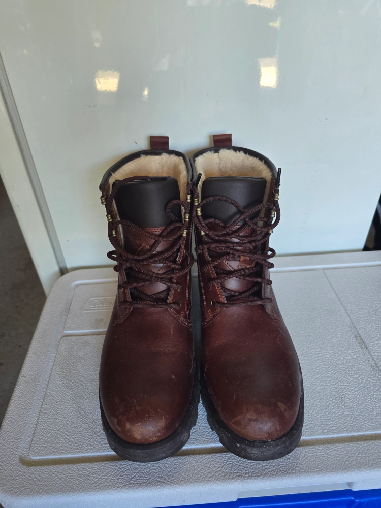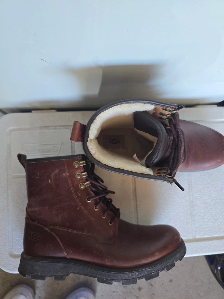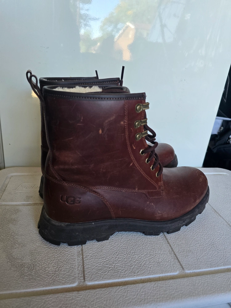 73Selling a pair of Ugg waterproof leather boots in size 10. They are in good condition and perfect for the Canadian weather. The boots are brown and have a lace-up closure. They are also lined with wool to keep your feet warm and cozy!