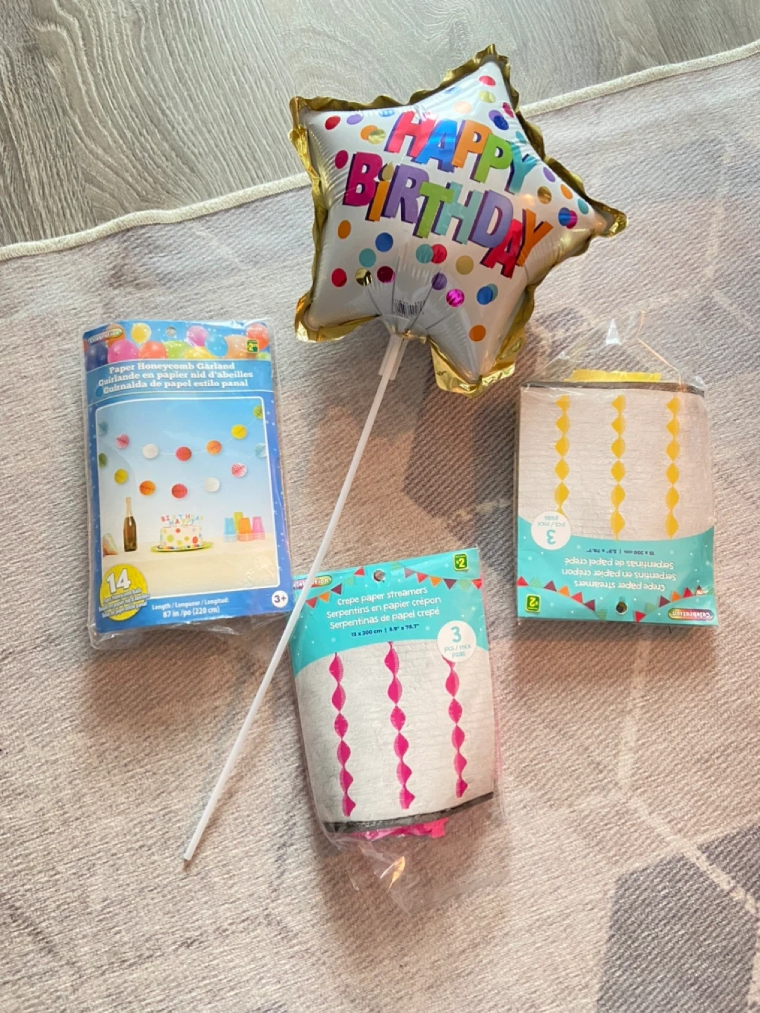 Giving away birthday/party decor. Includes a paper honeycomb garland, crepe paper streamers, and a Happy Birthday balloon