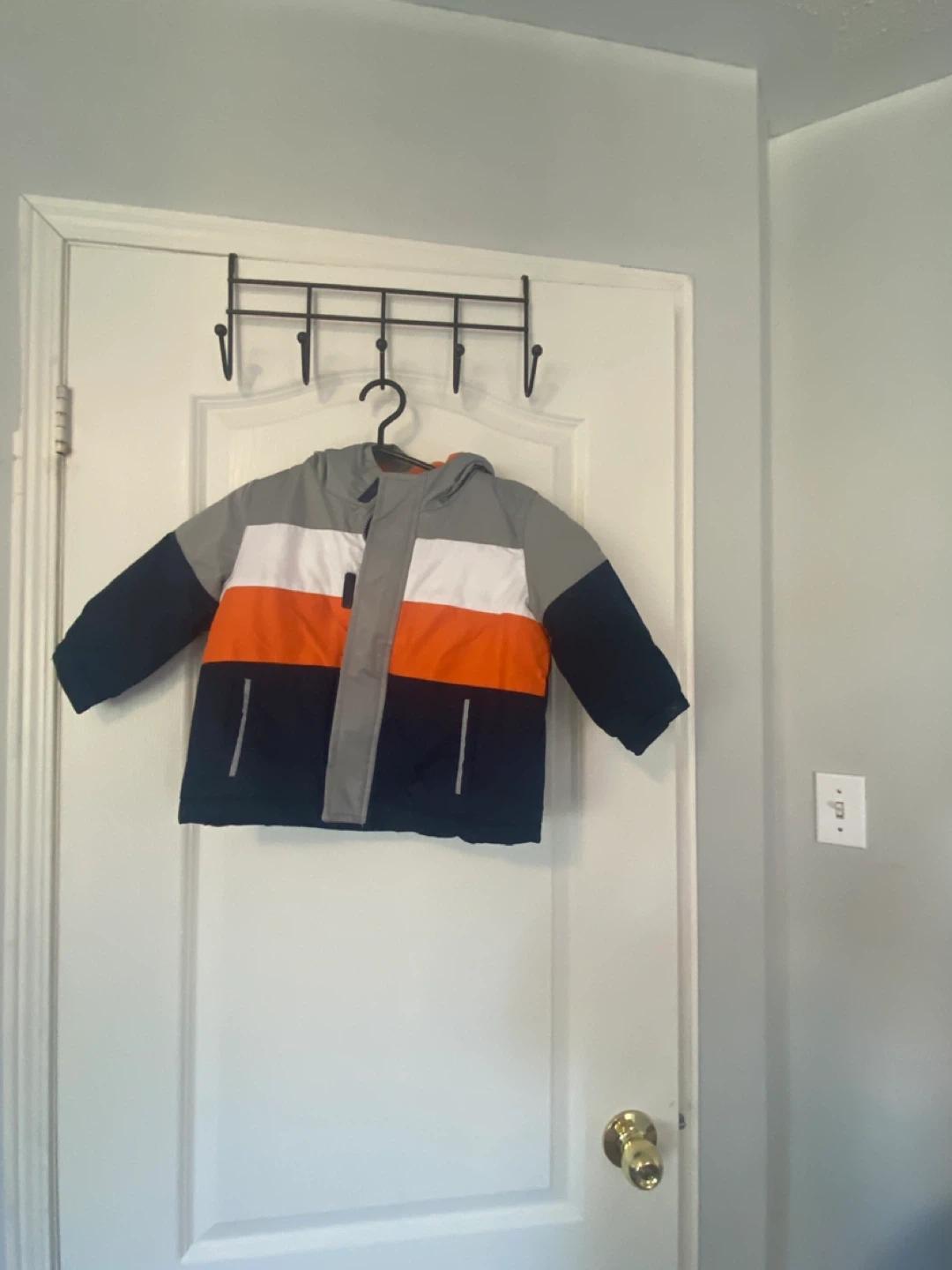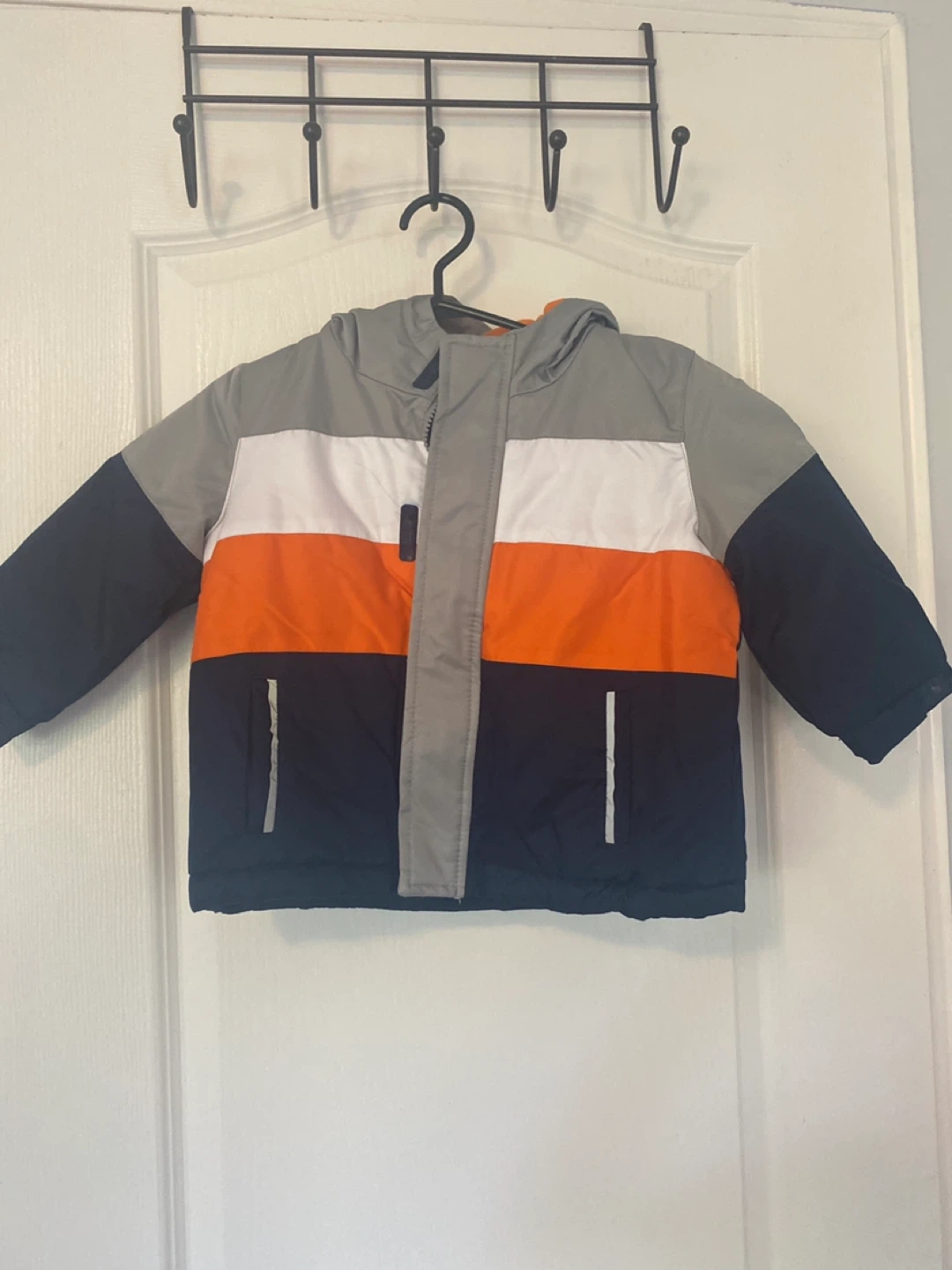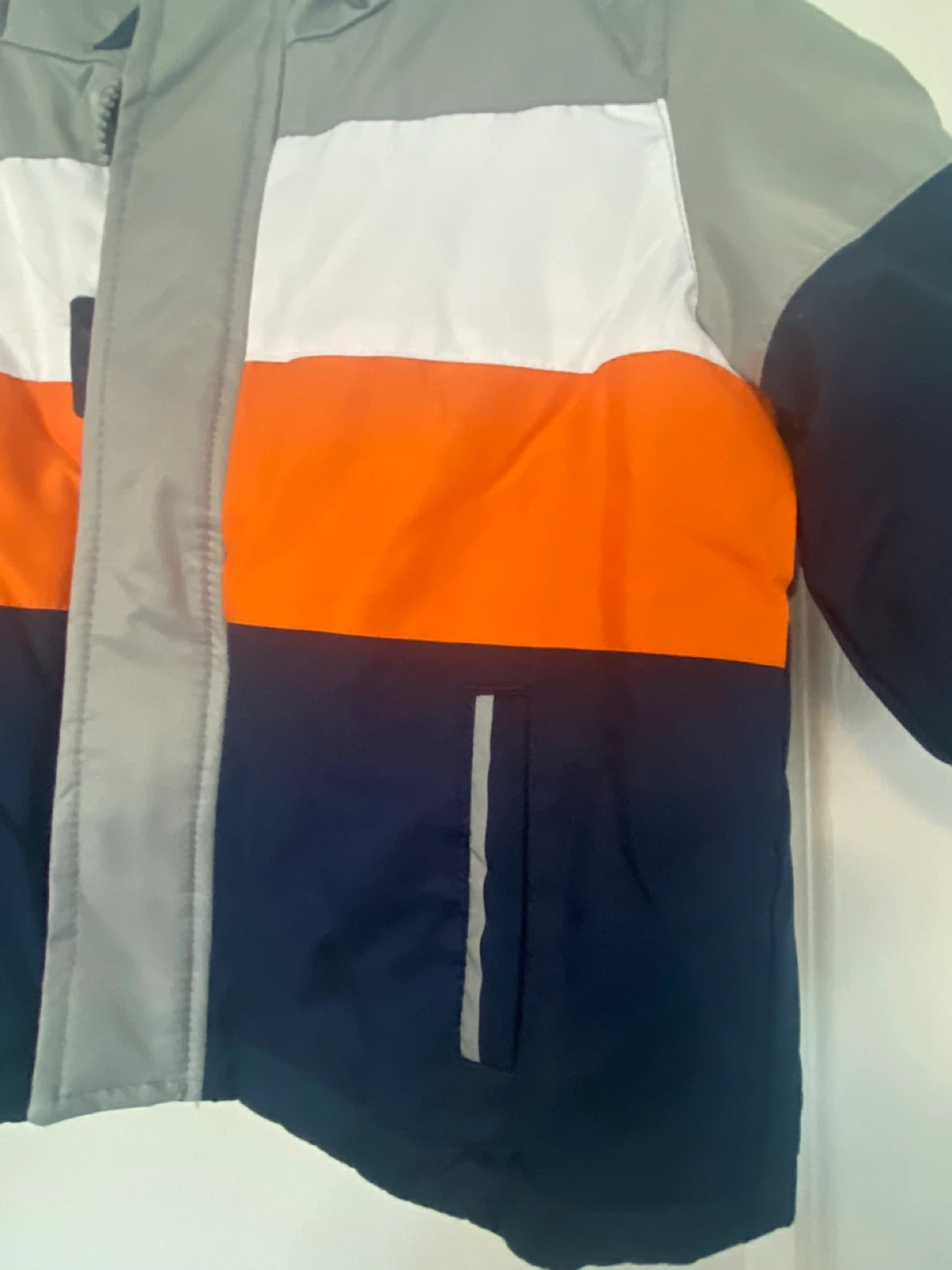 Here's a cute colour block puffer jacket for kids! It's in great condition and ready for a new home. The jacket features a hood and handy pockets. Perfect for keeping your little one warm and stylish during those chilly days!