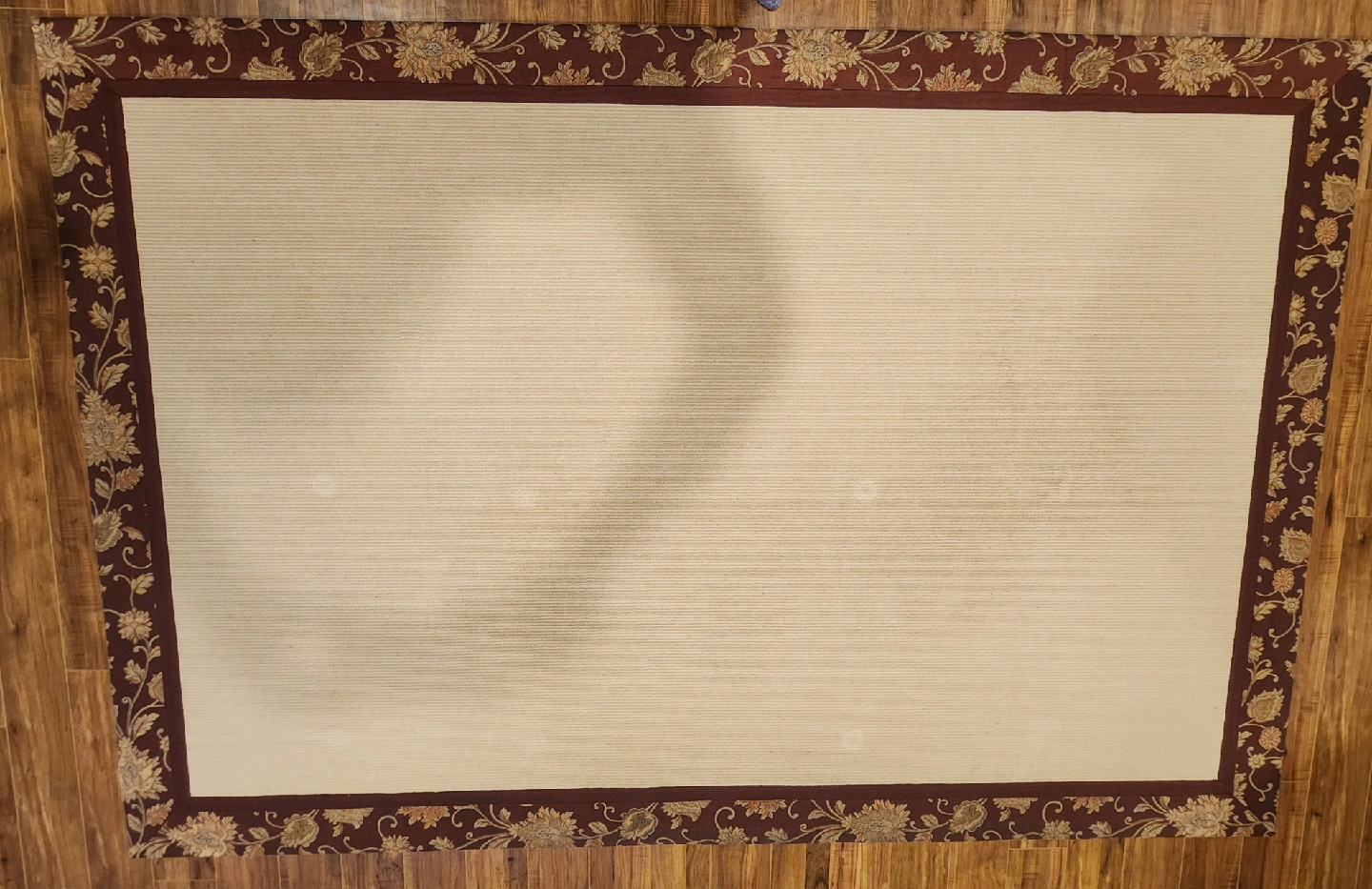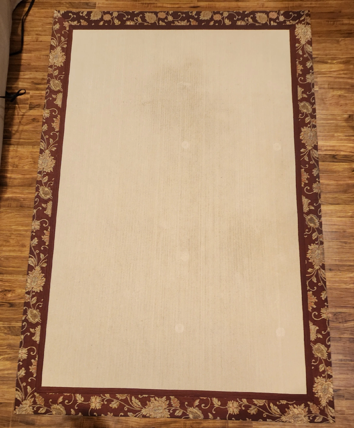 Selling a gently used area rug with a beautiful floral border. It's in great condition and would look great in any room! The rug features a neutral center with a burgundy and floral patterned border.