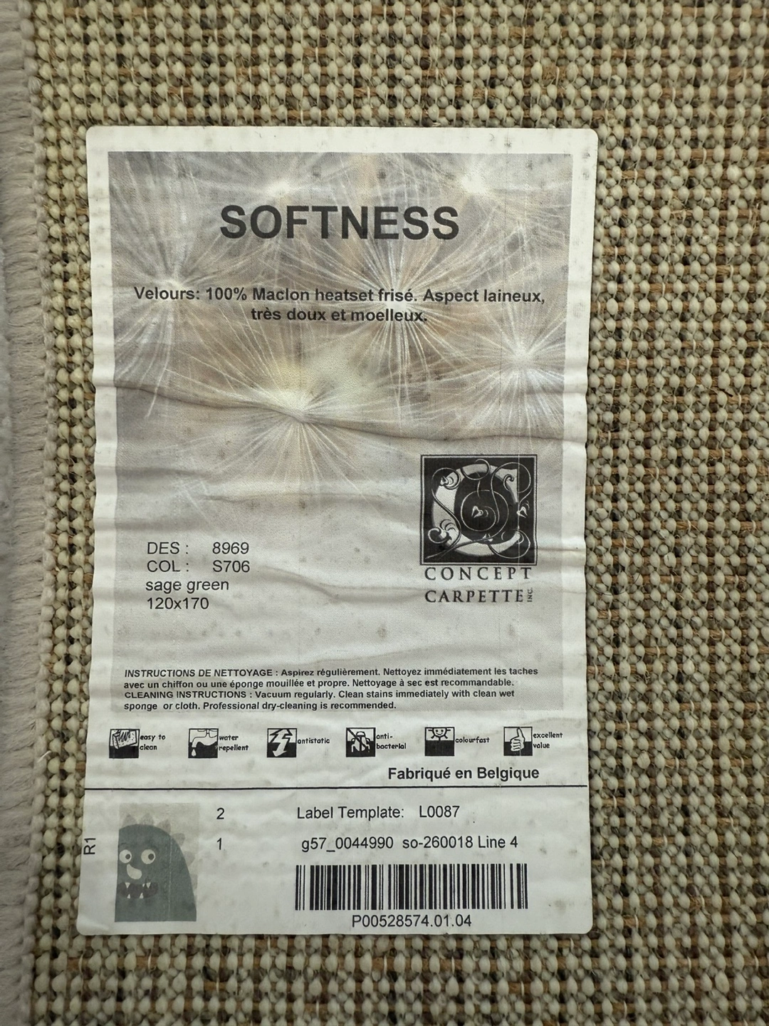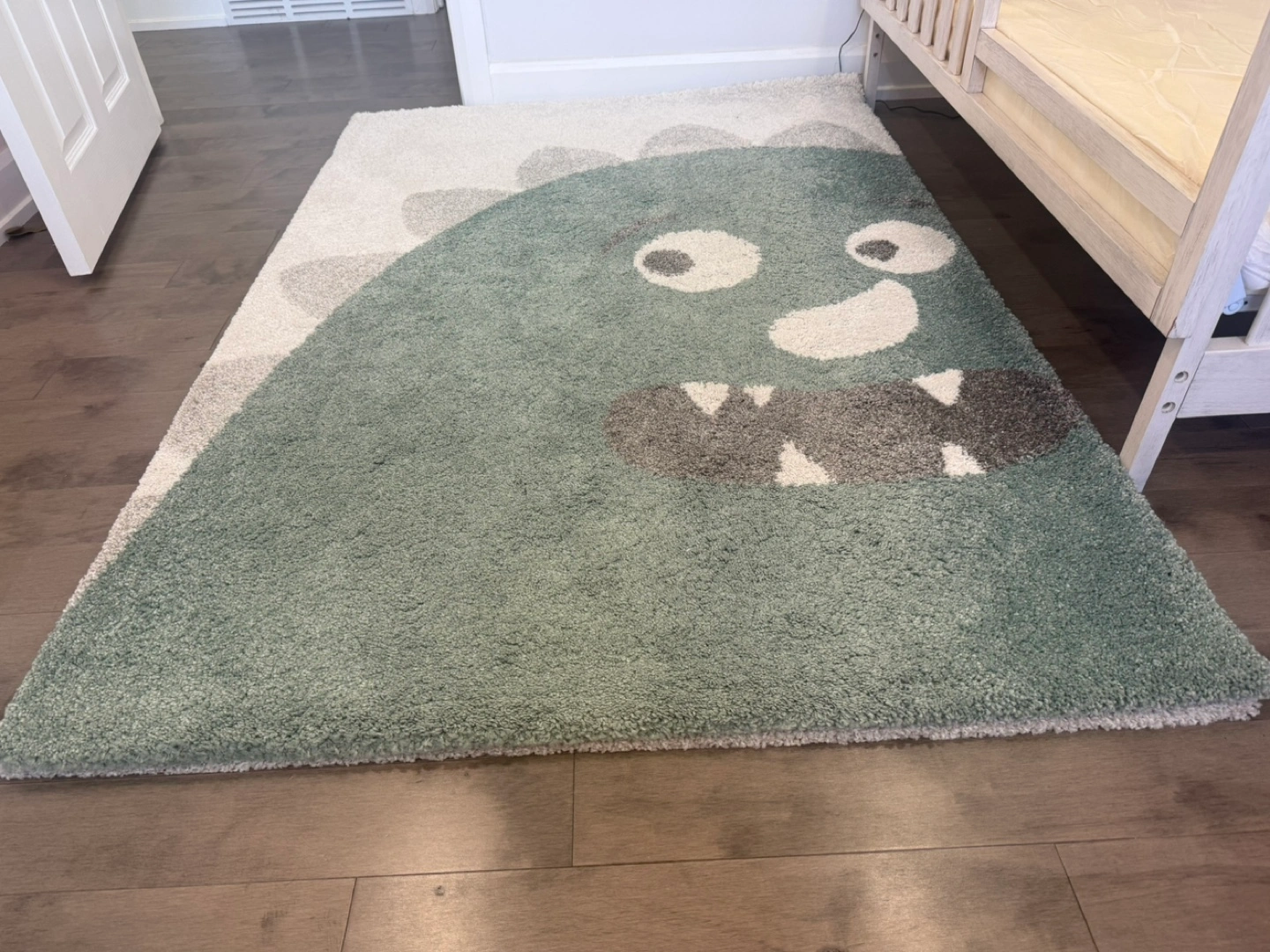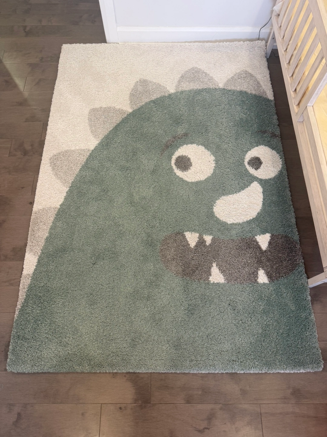 Selling a cute monster rug! It's a Concept Carpette rug, and the label says it's made of 100% Maclon heatset frisé. The size is 120x170, and the colour is sage green. It's super soft!