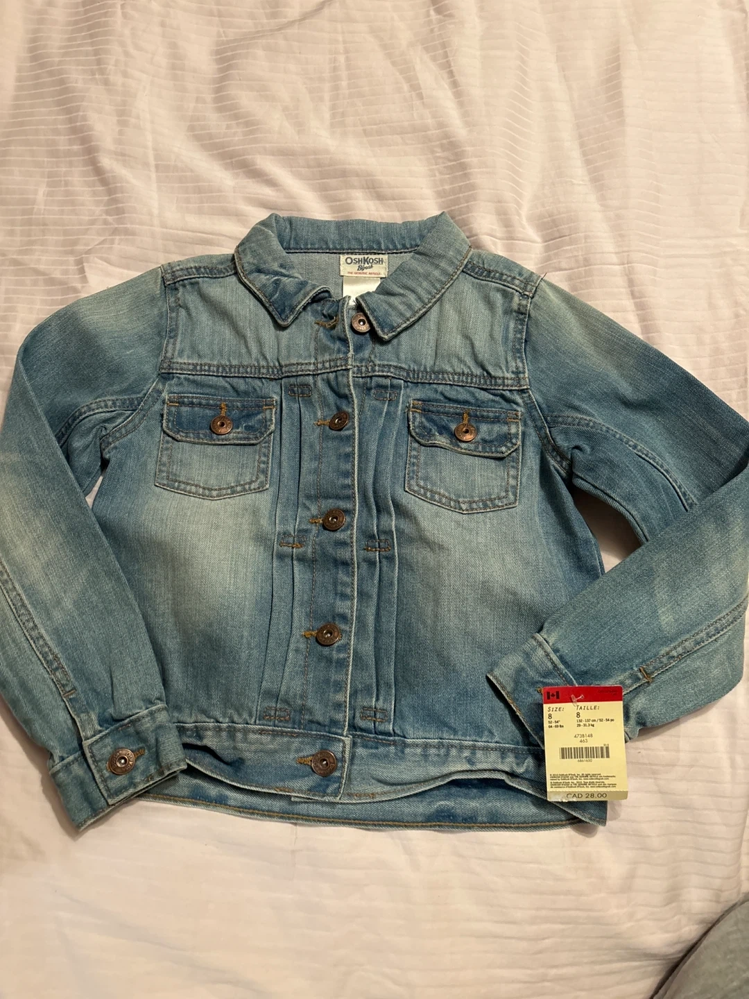 Selling an OshKosh denim jacket in a kids' size 8! It's in great condition and ready for a new home. The tag shows it was originally CAD $28.00