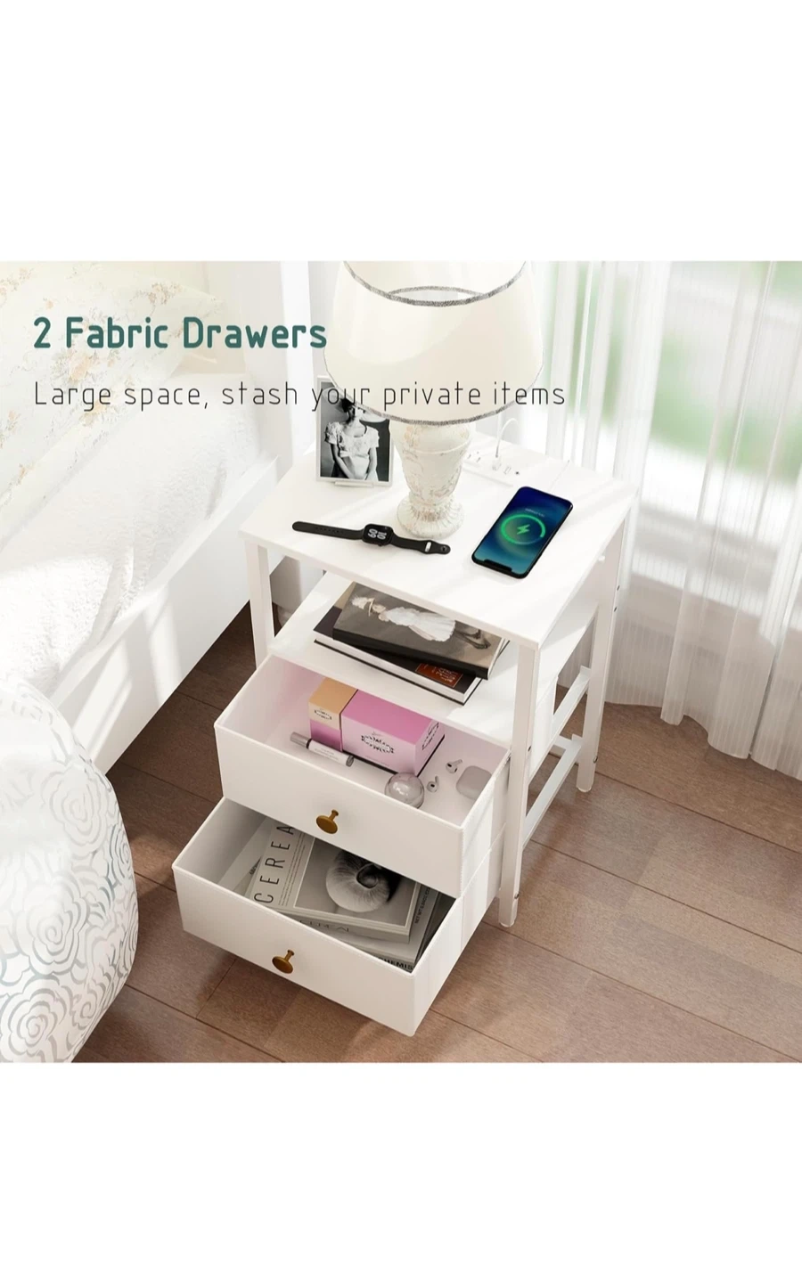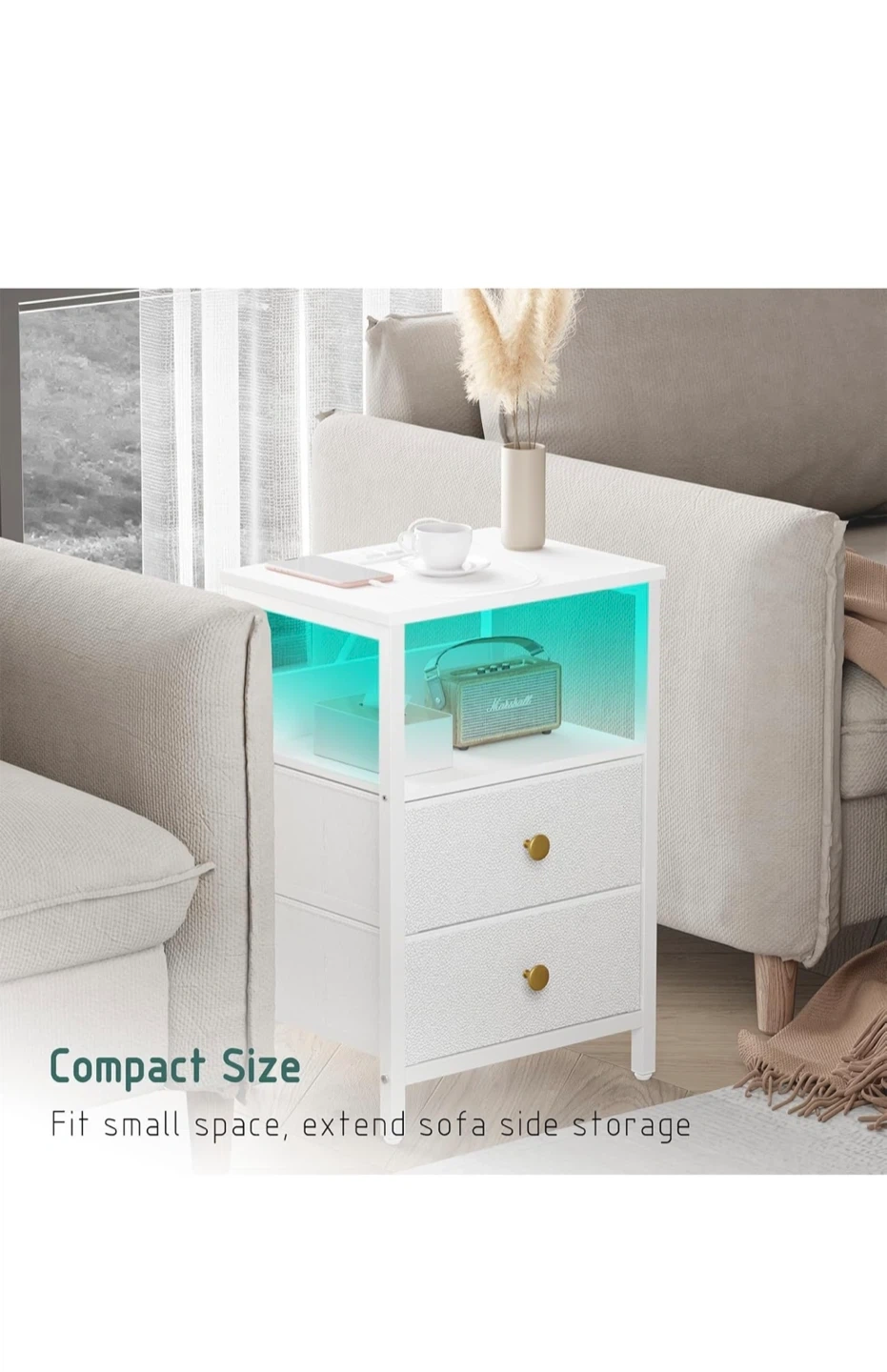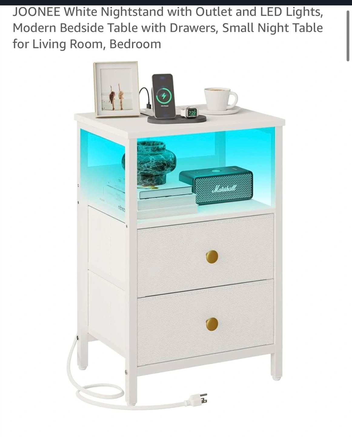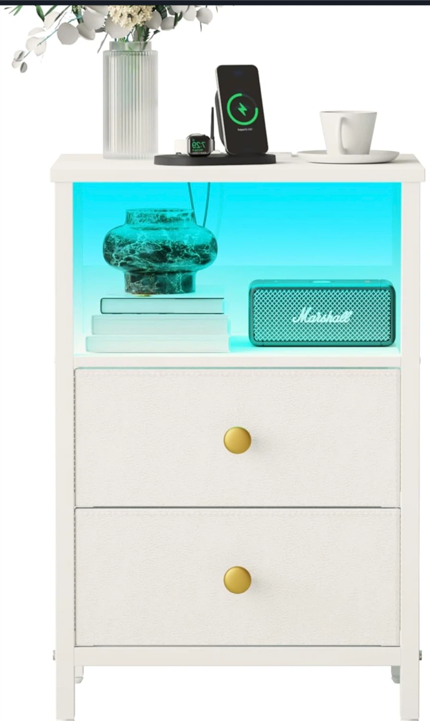 This is a JOONEE white nightstand with an outlet and LED lights! It's a modern bedside table with drawers, perfect as a small night table for a living room or bedroom.