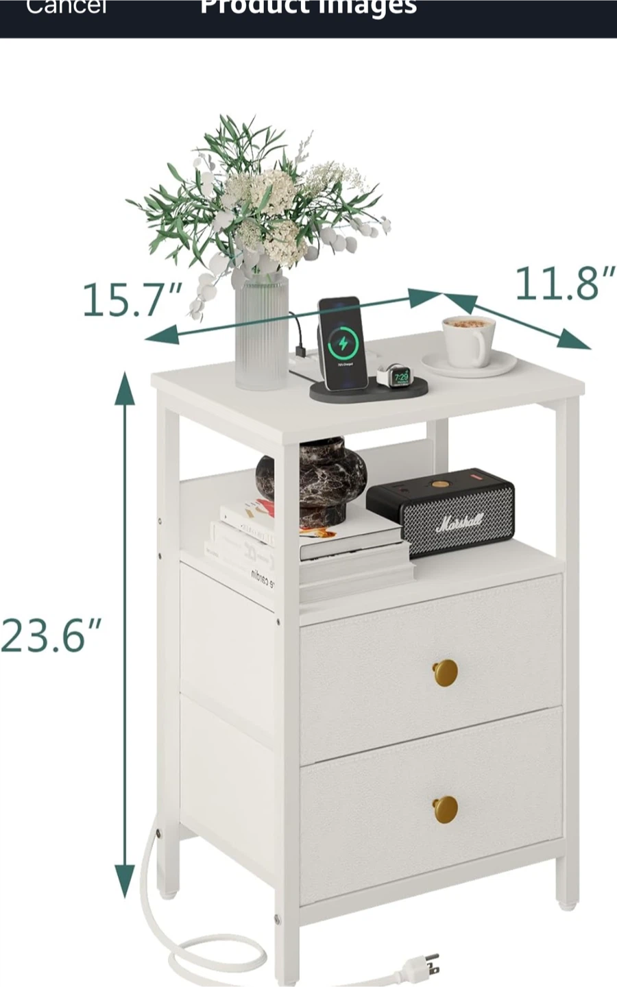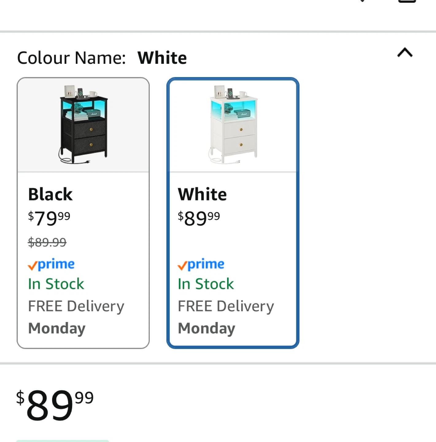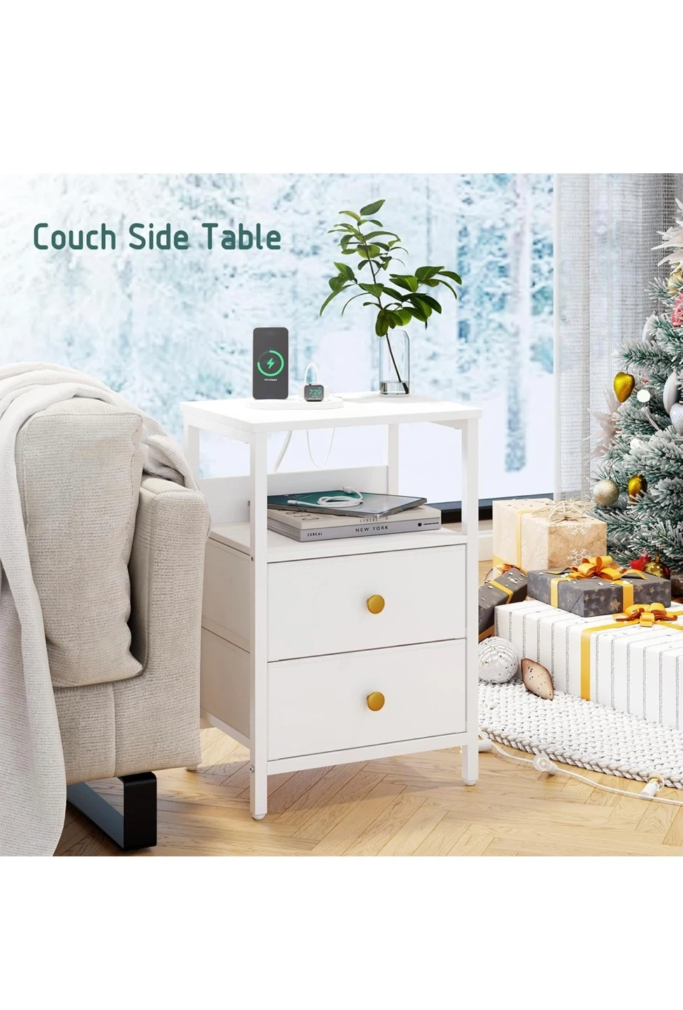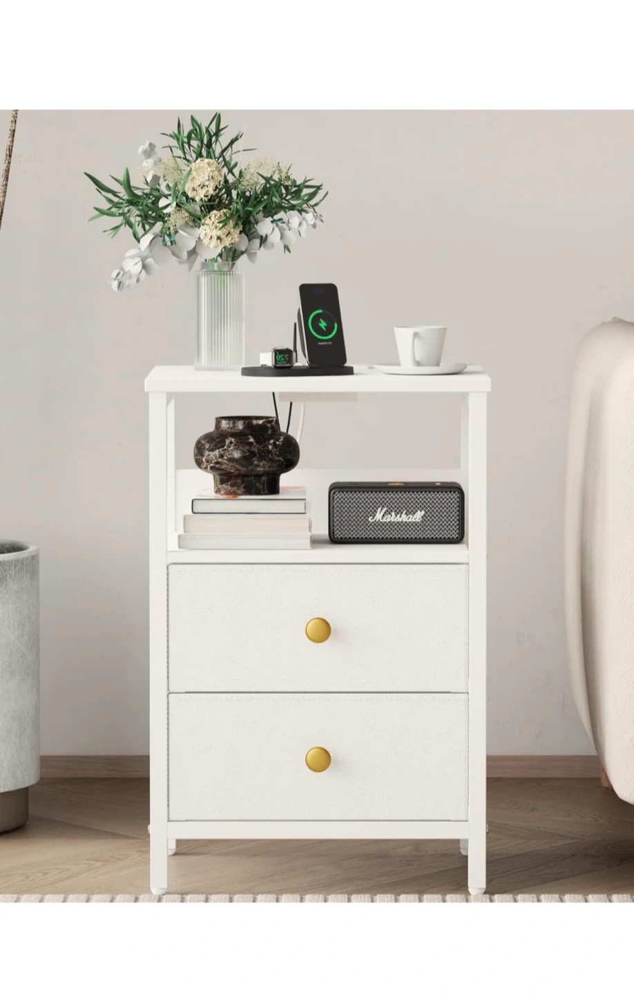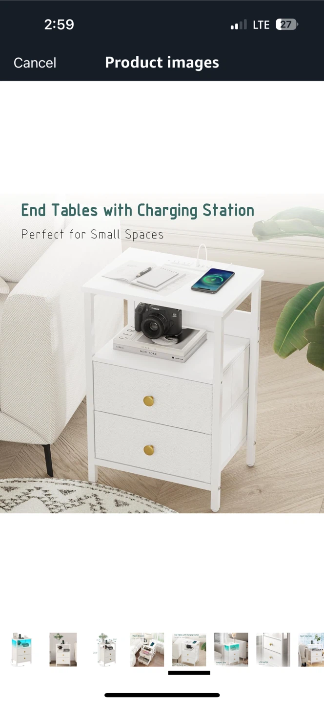 This is a JOONEE white nightstand with an outlet and LED lights! It's a modern bedside table with drawers, perfect as a small night table for a living room or bedroom.