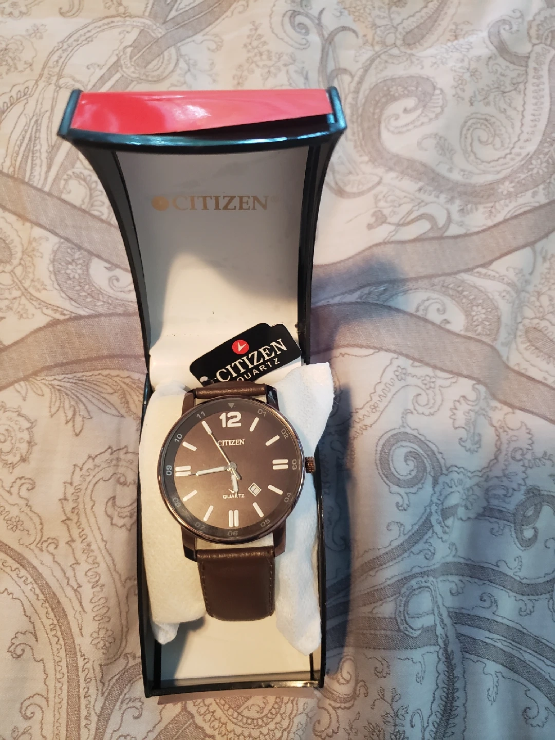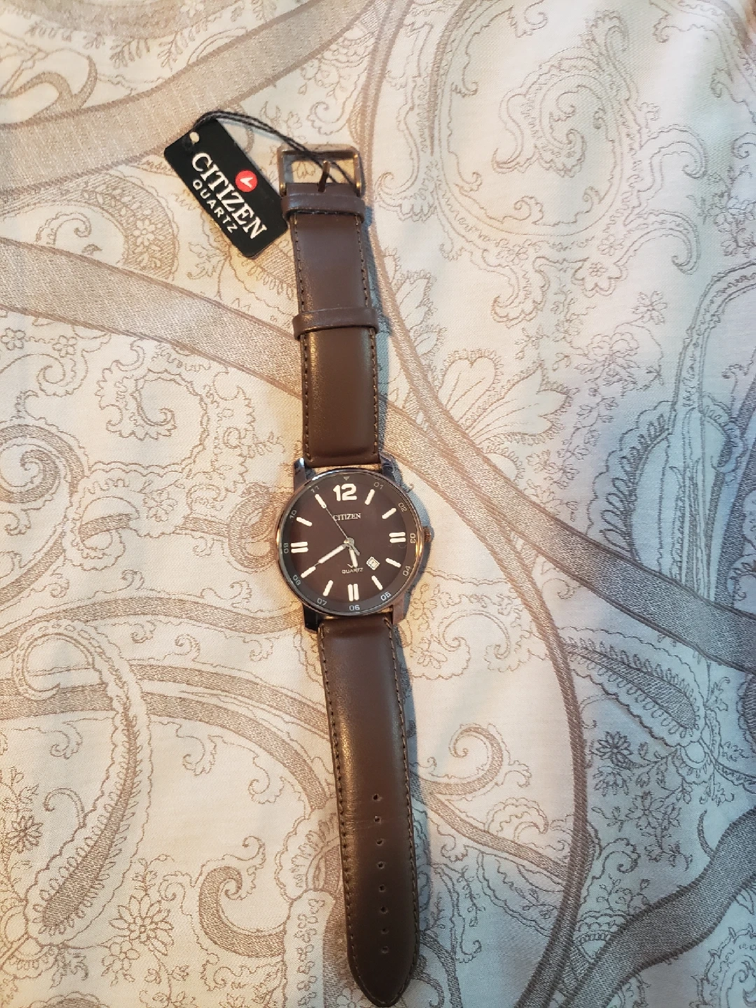 Selling a Citizen quartz watch with a brown leather band. It's in great condition and has a classic, stylish look. The watch face is easy to read, and the leather band is comfortable to wear. It's a perfect everyday watch!