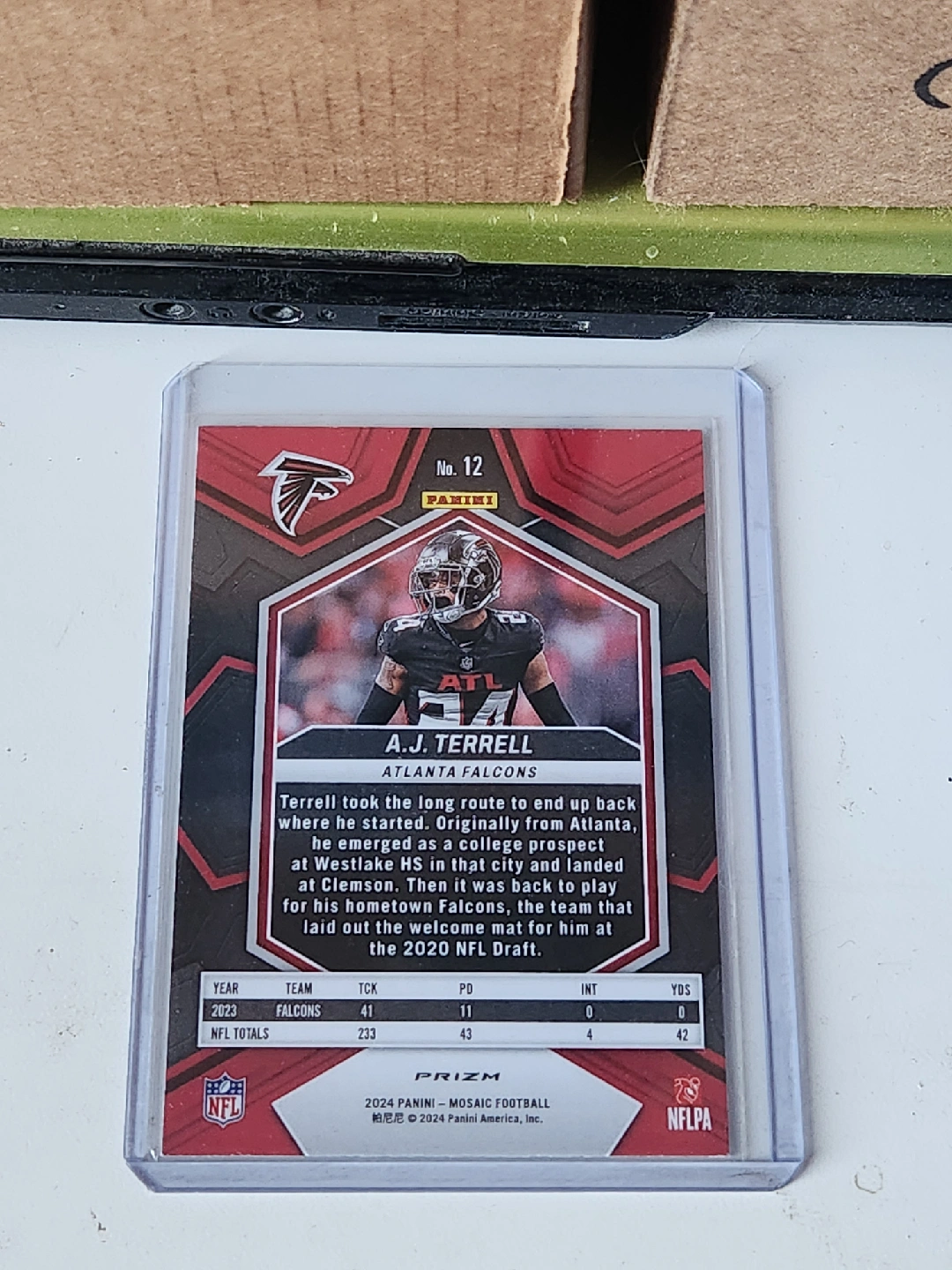 65Selling an A.J. Terrell football card from the Atlanta Falcons. It's a 2024 Panini Mosaic Football card, No. 12. A great addition for any football card collector!