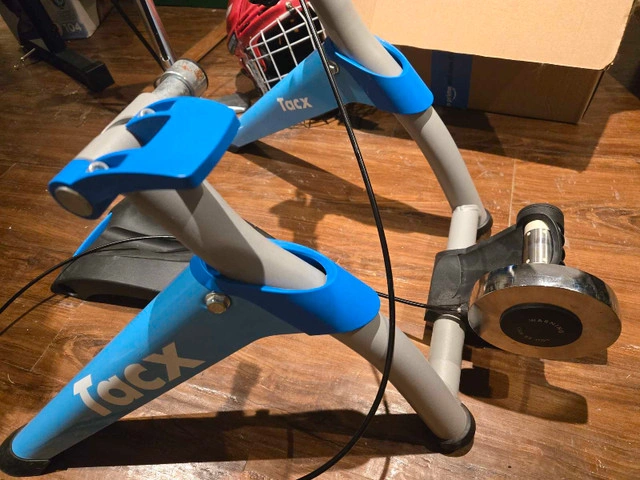 Get ready to elevate your indoor cycling experience with this Tacx indoor bike trainer! This trainer is designed to provide a realistic road feel, allowing you to maintain your training regimen regardless of the weather outside. It's in good working condition, ready to help you achieve your fitness goals. Additional details: * Sturdy and stable frame * Adjustable resistance levels * Compact and easy to store