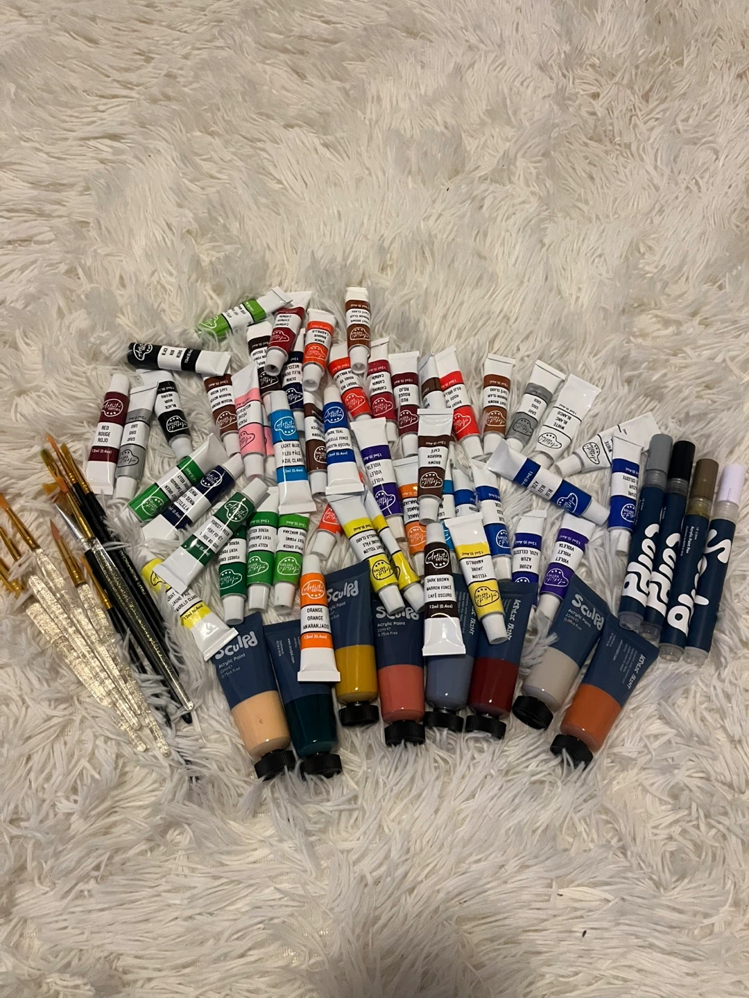 Selling a collection of acrylic paint tubes from brands like Sculpd and Artist Loft, along with some brushes. Lots of different colours to choose from! Perfect for starting a new art project or adding to your existing supplies