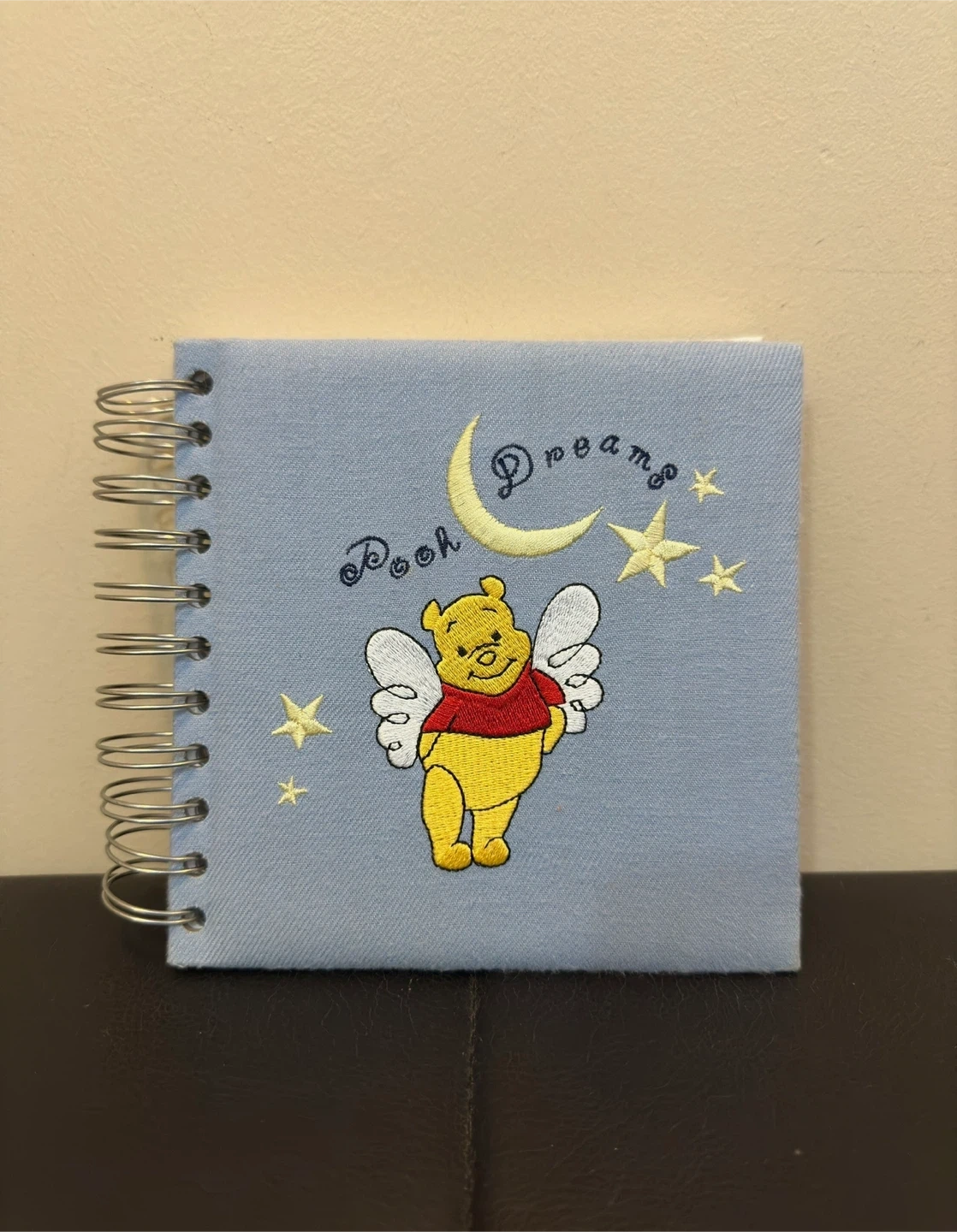 Super cute Winnie the Pooh notebook! Features an embroidered design of Pooh with angel wings under a crescent moon and stars. Perfect for jotting down your thoughts or dreams!