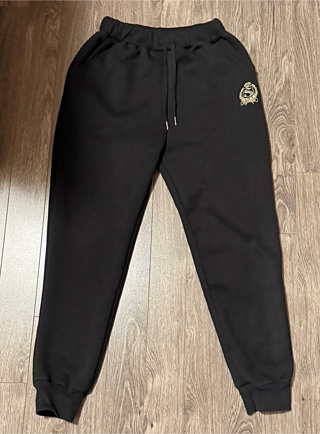Selling a pair of black sweatpants from Celedress. They're in great condition and features a gold-coloured logo on the upper thigh. Perfect for lounging or running errands! Size - Large. CASH ONLY PICK UP ONLY