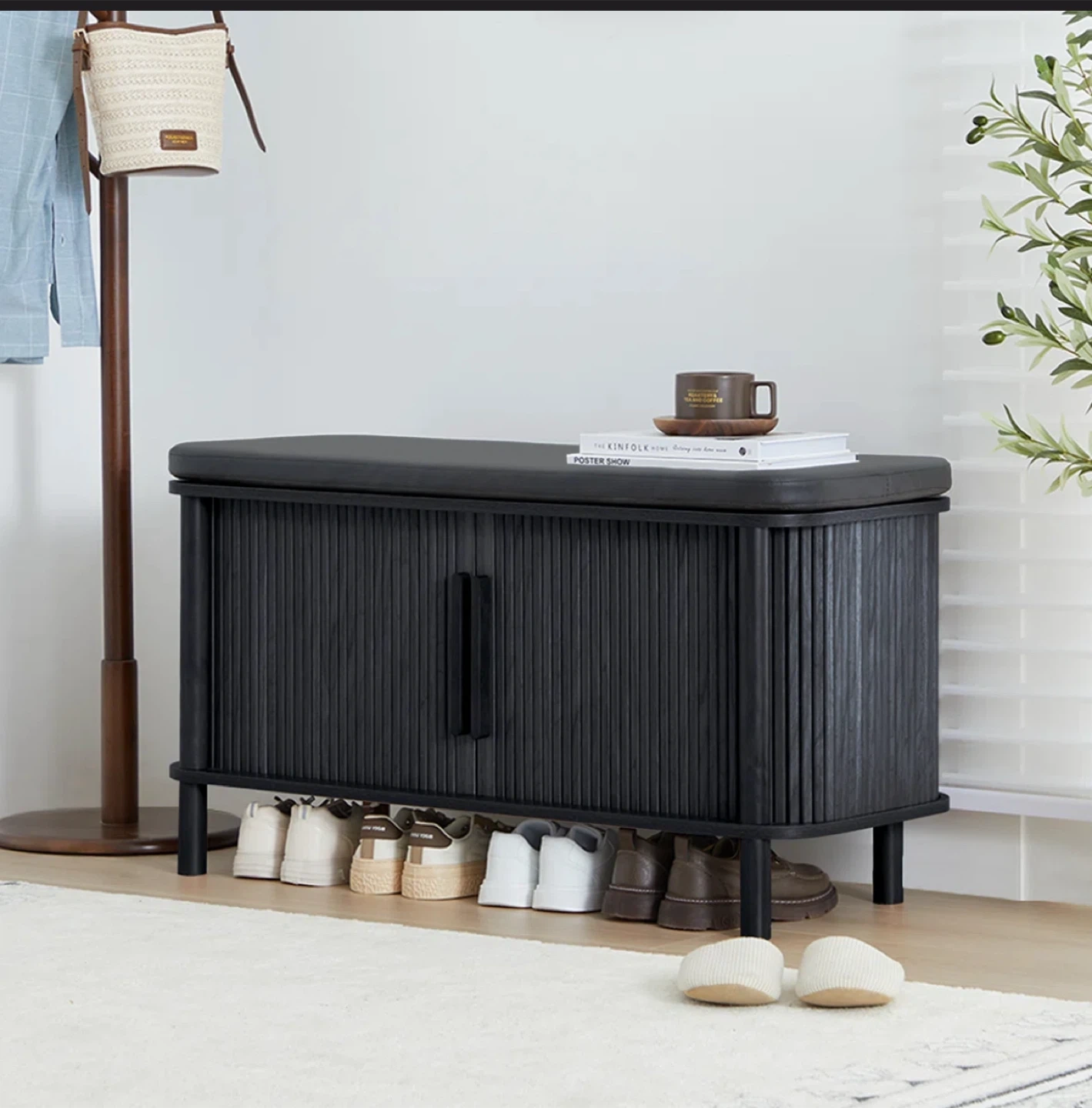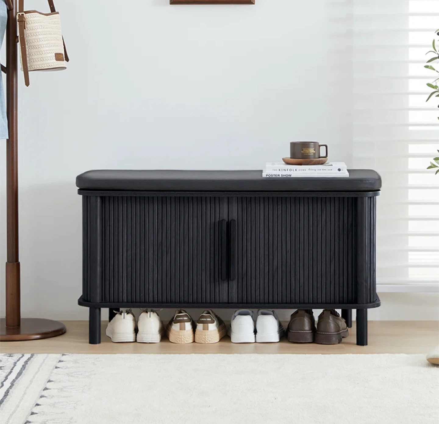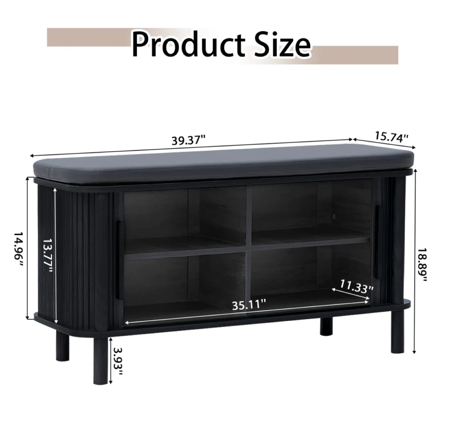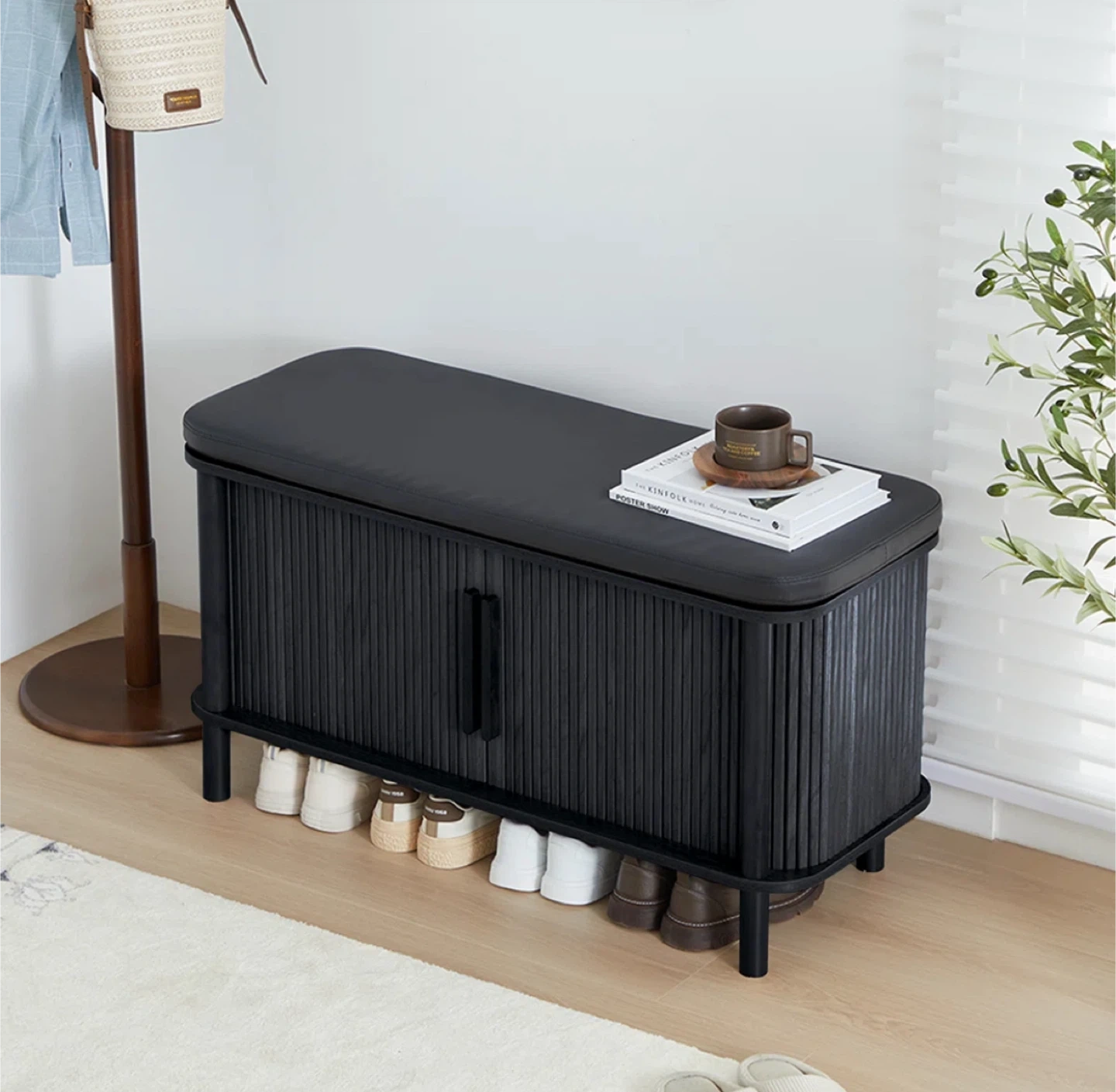 Looking to declutter your entryway? This black shoe storage bench is the perfect solution! It features a padded seat for comfortable sitting while you put on or take off your shoes.