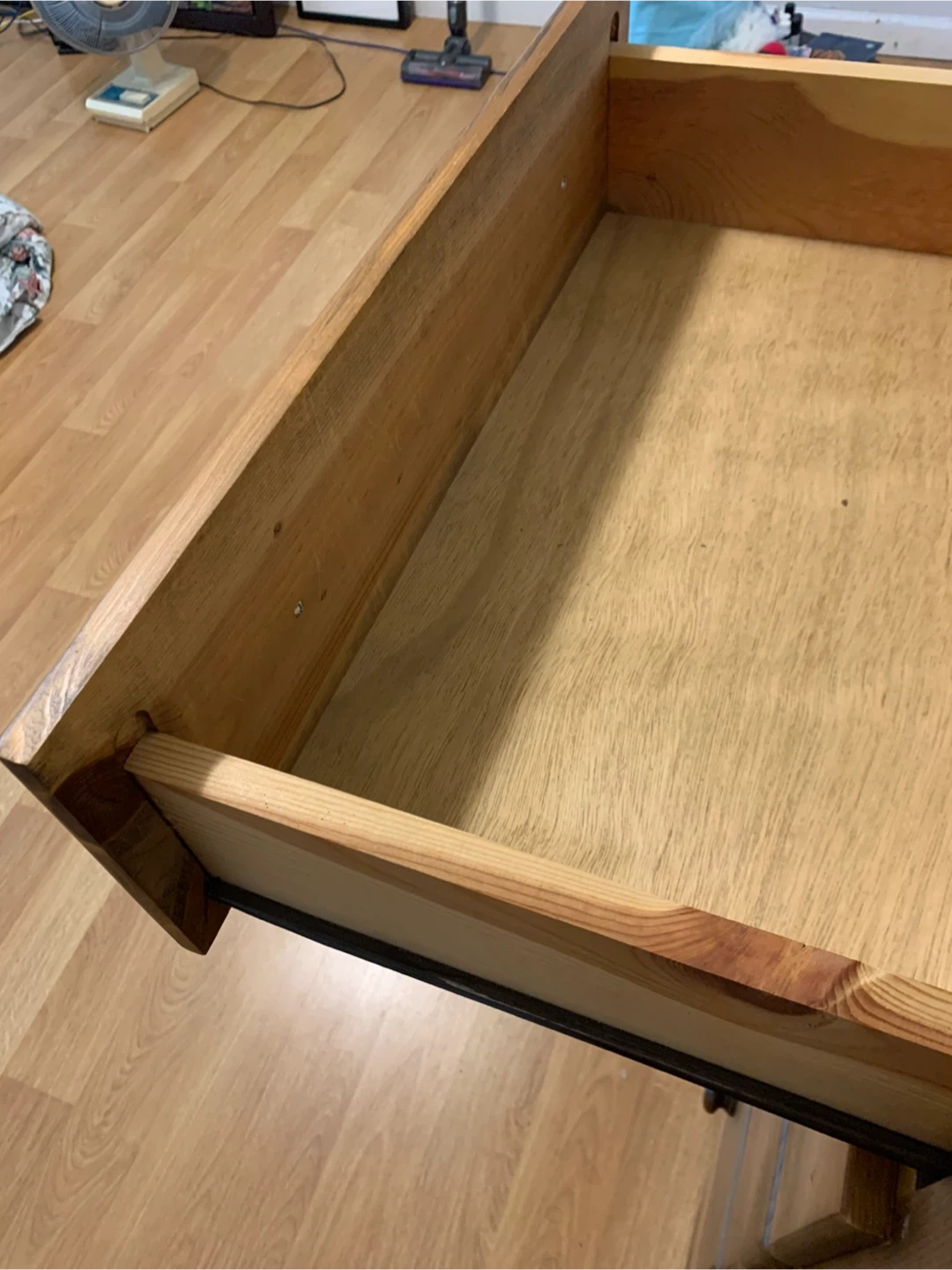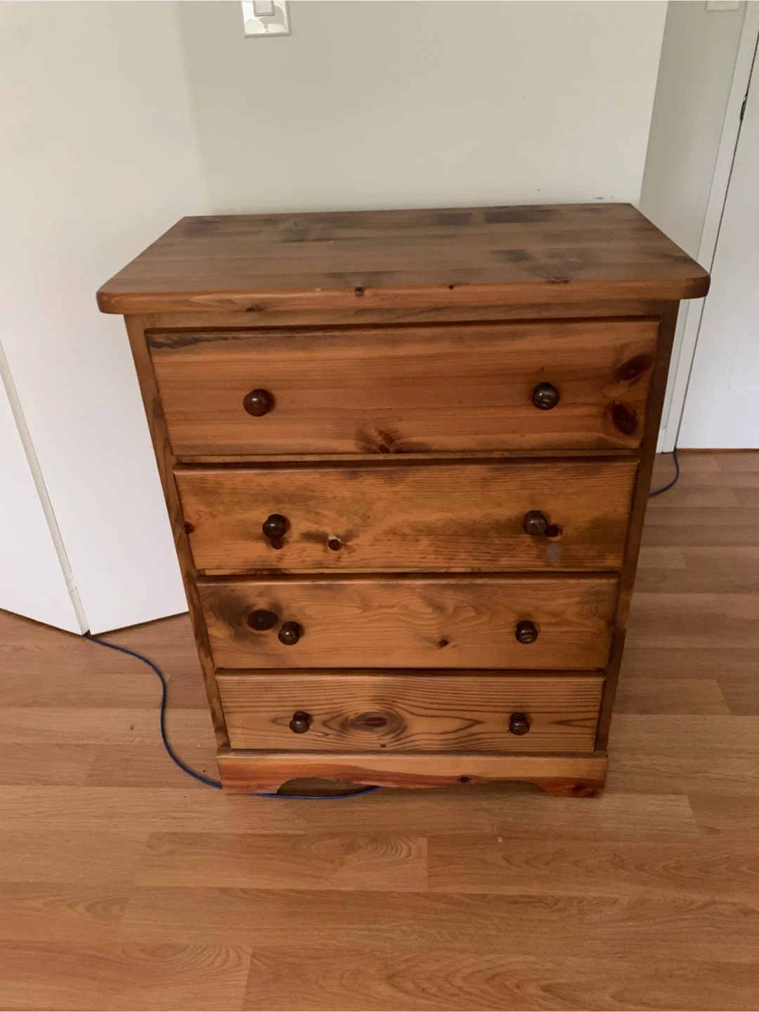 Solid pine wooden dresser, stained to look like oak. It has four drawers and It's perfect for storing clothes or other items. It's in very good condition and ready for a new home