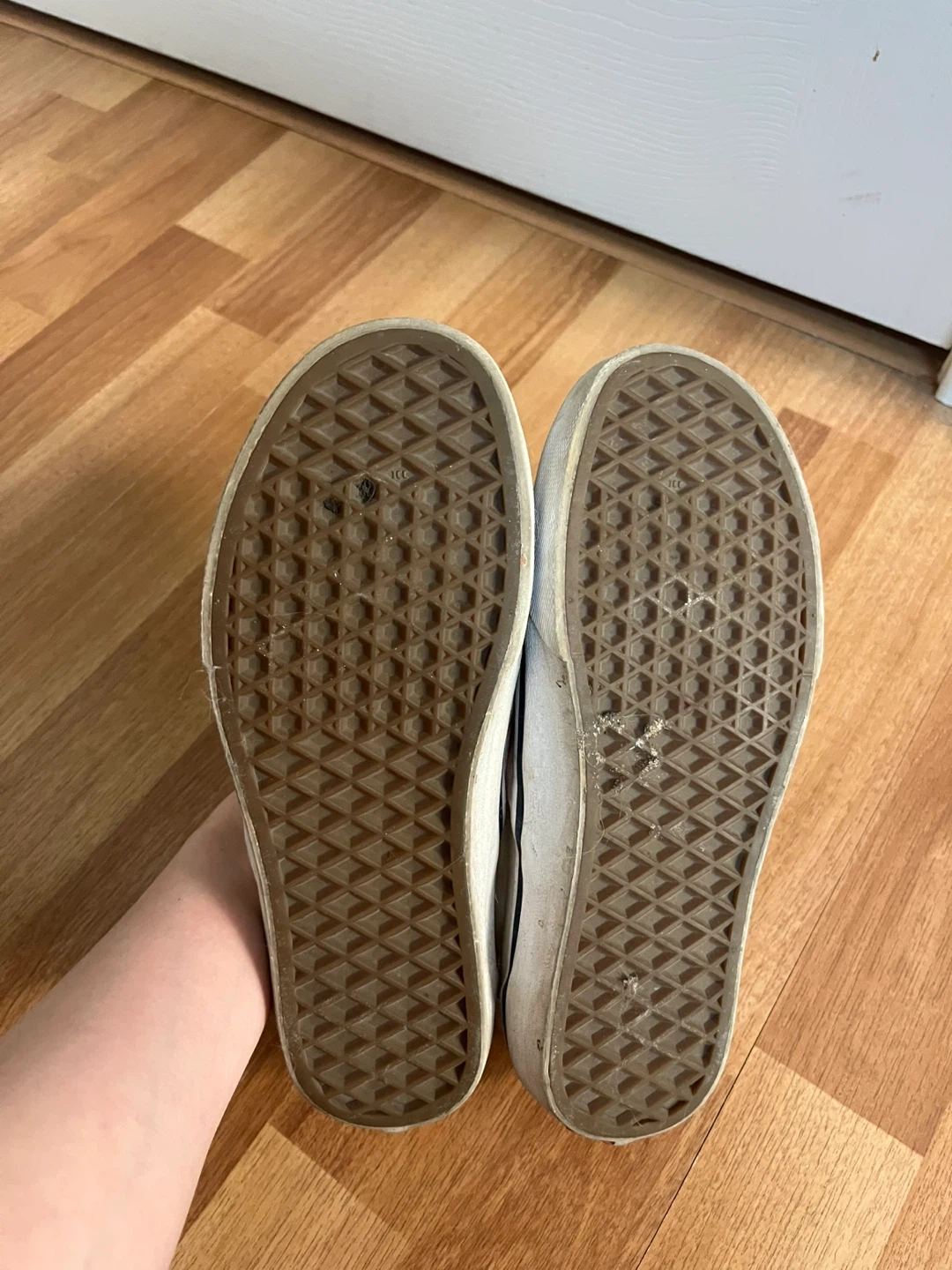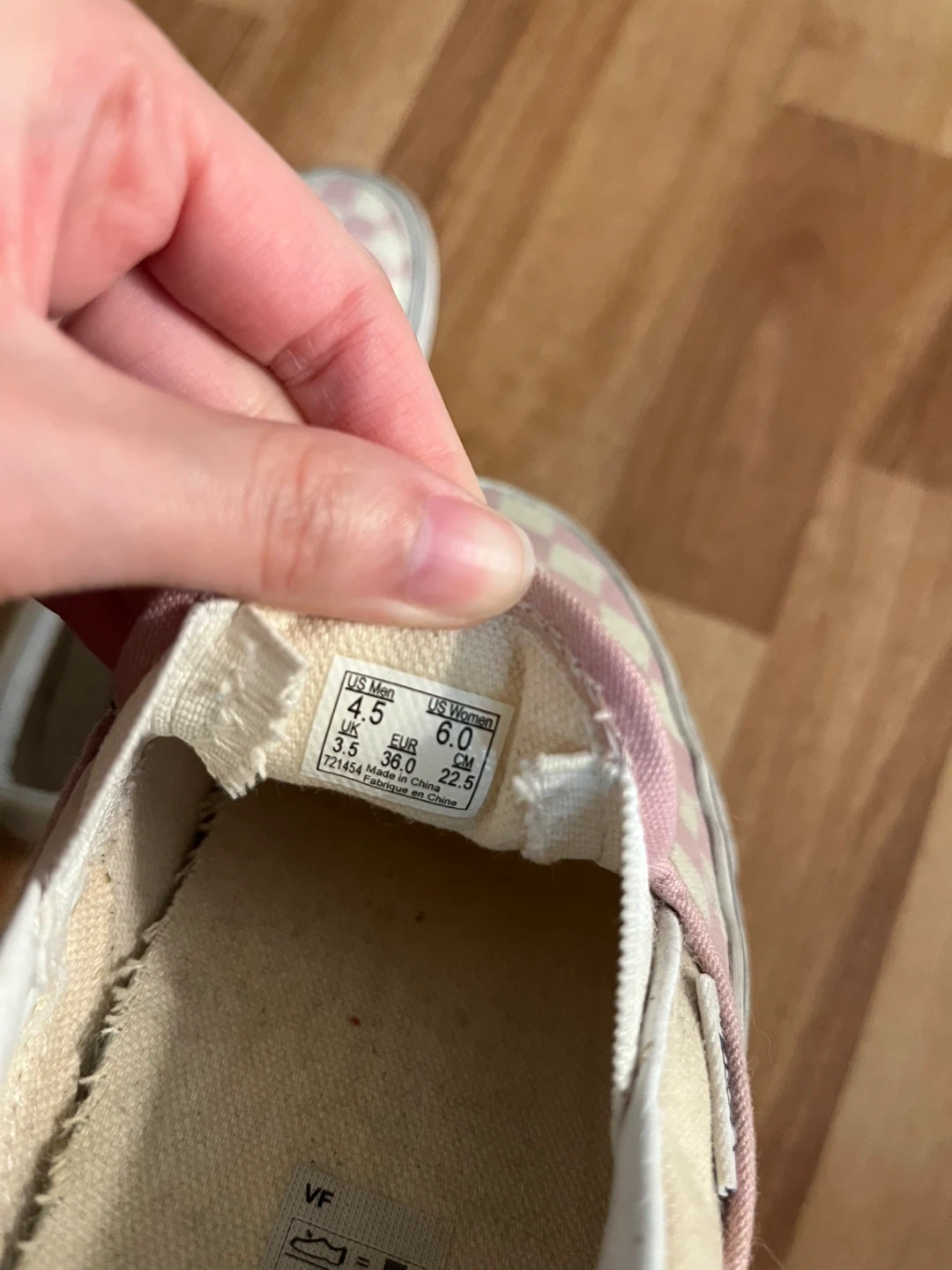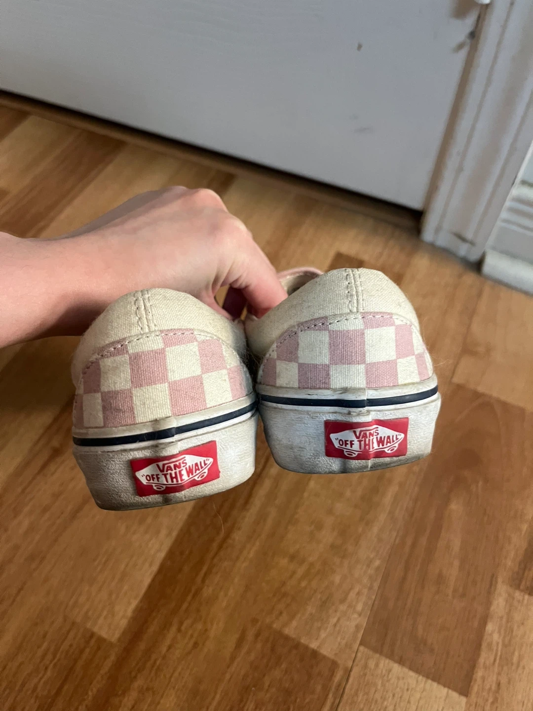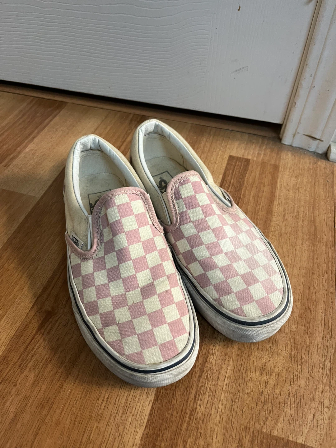 Selling a pair of Vans slip-on shoes with a pink checkerboard pattern. They're in used condition, as you can see from the photos. The size is US Women's 6.