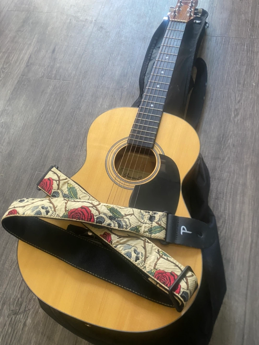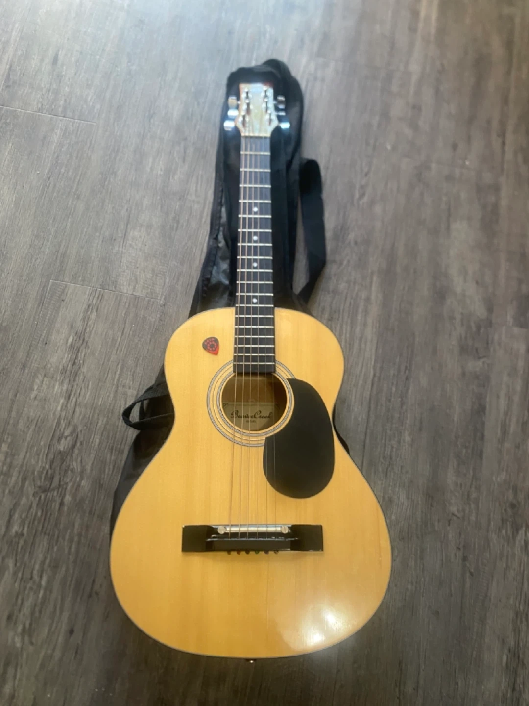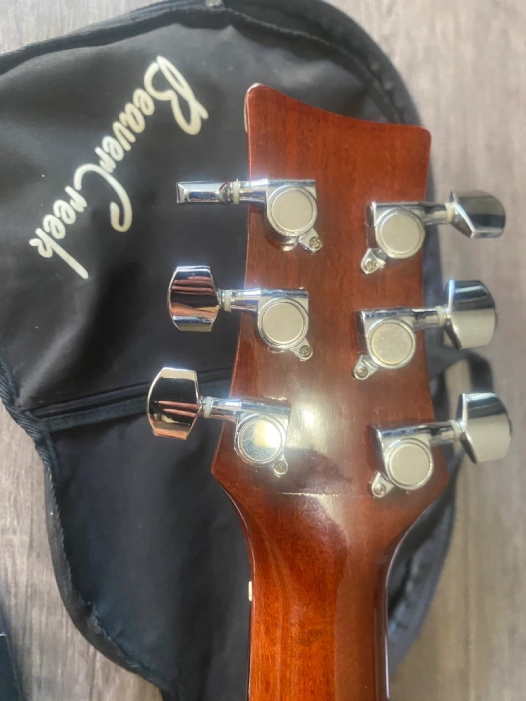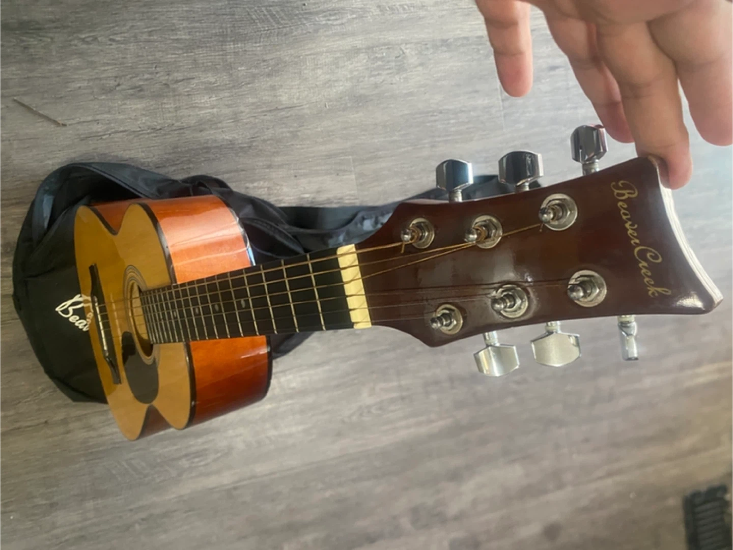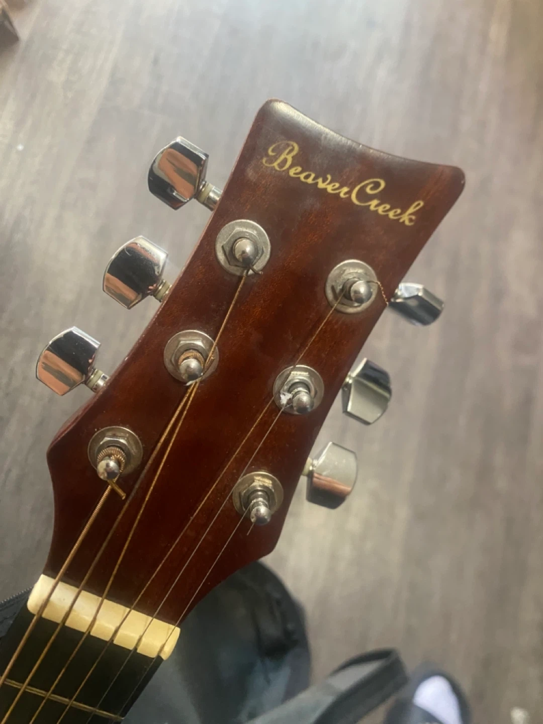 Selling a Beaver Creek acoustic guitar and (FREE Guitar Strap). Comes with a case for easy transport and storage. The guitar is in good condition and ready for a new owner to enjoy making music! The keys hold up the way a Beaver Creek should. I've taken pictures of the action and the overall condition which is still in decent shape for its age. Other than that it just needs new strings.