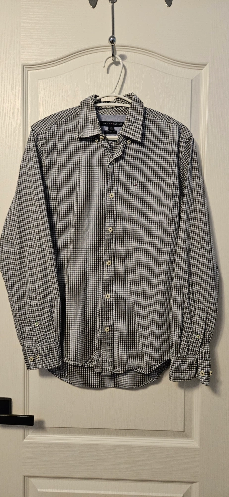 Here's a Tommy Hilfiger custom fit button-down shirt in size small! It features a classic checkered pattern, perfect for a casual or semi-formal look. The shirt is in great condition and ready for a new home