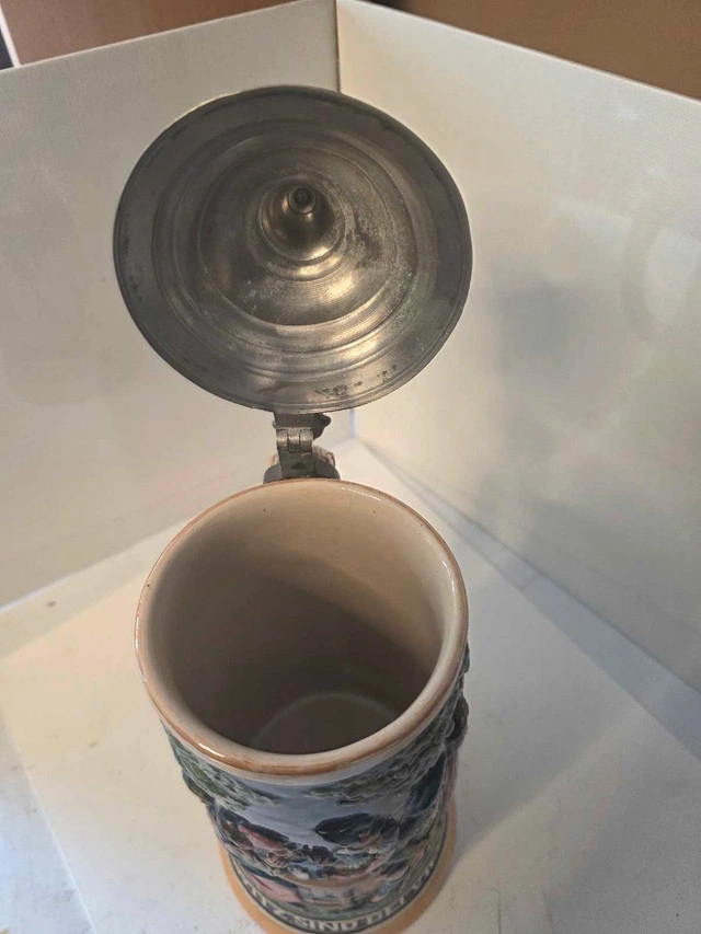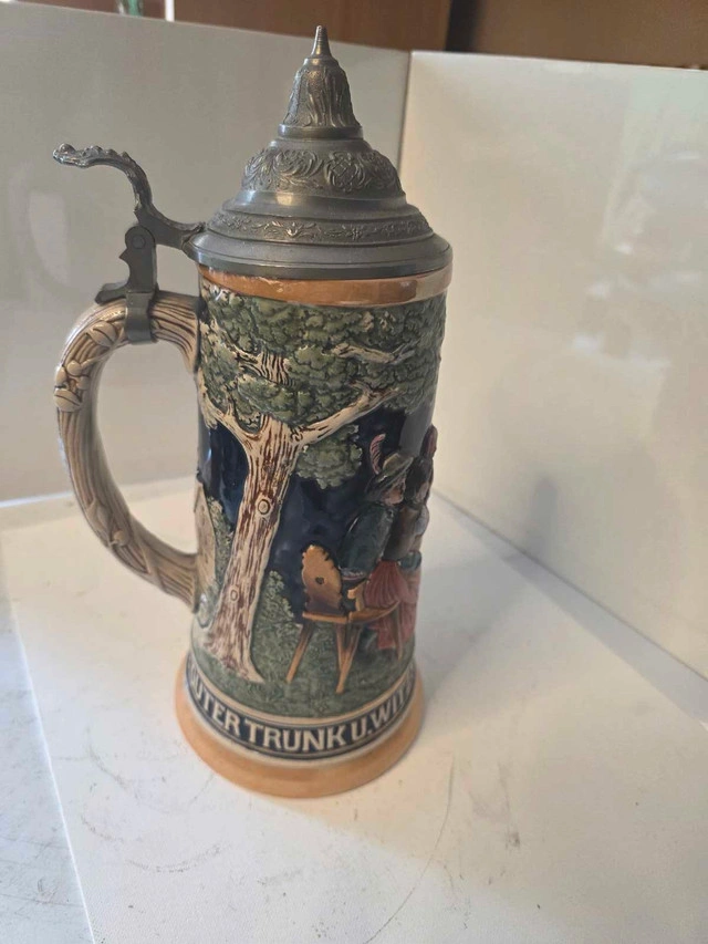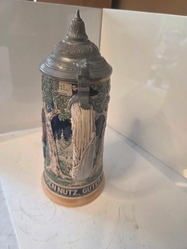Click on the pictures to get a better view. This is a used German beer stein with a pewter lid and intricate detailing depicting a traditional German scene. The stein is in very good condition, showcasing vibrant colours and well-preserved craftsmanship. A great addition to any collection or a unique decorative piece. It stands approximately 11 inches tall and has a substantial, weighty feel at 3 lbs 15 oz. Auction sales show a value about $100 US. I have priced this below market value to give resalers a chance to make a profit. Look up my other listings and bundle lists together with either the items and make me an offer.